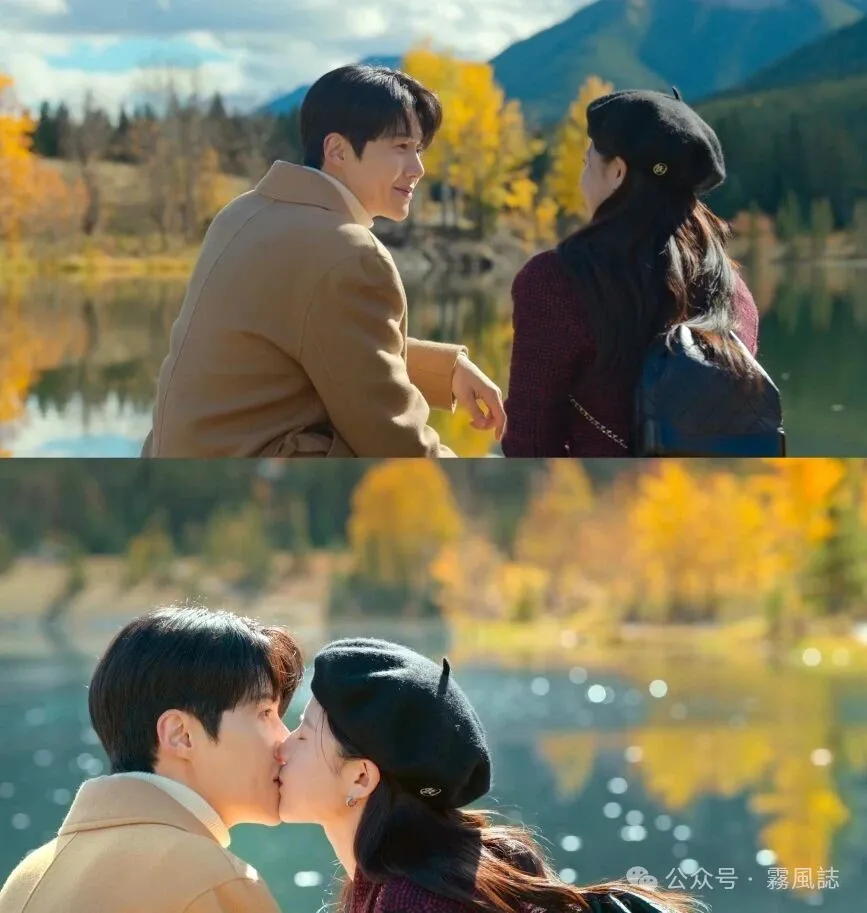 另外这部剧摄影上格外亮眼的部分,是跨越日韩、加拿大、意大利的海外实地取景,这些场景主要为主角浪漫爱情主线服务,尤其室外景的部分,大多运用远景为空间和情绪注入呼吸感,空间开阔、观感舒适,明亮且高饱和的色彩增添了不少华丽感,还有绝美的极光加持,根本不需复杂的调度,美景配上这对高颜值cp画面已然自成一景。