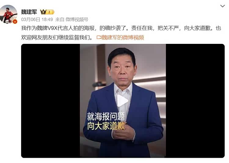 3月6日晚上,魏建军做了一件很多车企一把手都不太会做的事——他在镜头前,为一张“偷懒”的海报公开道歉。