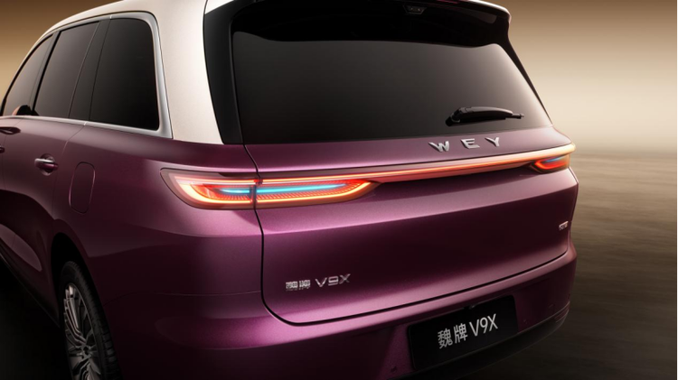 魏牌V9X的前脸以中轴对称布局,致敬了迈巴赫、劳斯莱斯等顶级豪华品牌的设计语言,但内核是东方建筑的精神中轴线。双层平直的前脸设计,源于“重檐庑殿顶”的灵感,层层叠叠、沉稳庄严。悬浮车标采用菱形结构,经玻璃表面微米级精密切割与蚀刻工艺打造,光线折射下呈现多切面宝石光泽。这些细节想要传达的是一种“克制且内敛的高级感”——不靠花哨线条,靠内在的骨架与底气。