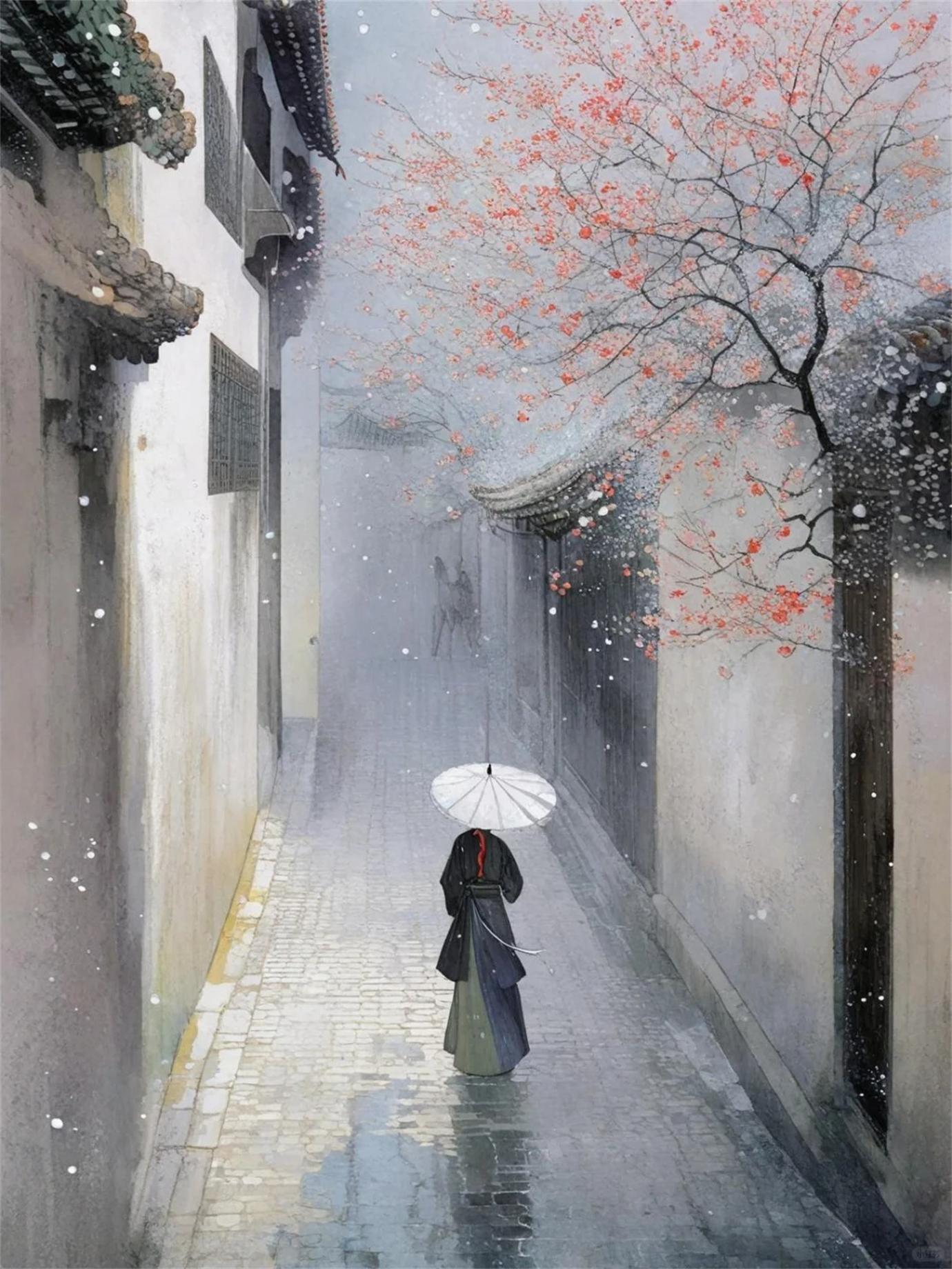 柳宗元的《江雪》通过“千山鸟飞绝,万径人踪灭”构建了一个极端静谧、空旷的冬日景象,随后“孤舟蓑笠翁,独钓寒江雪”描绘了老翁独自垂钓的特写,形成了鲜明的对比与强烈的视觉冲击。此诗以孤寂的垂钓者形象,象征了诗人自身的高洁与坚韧,以及在逆境中坚持自我、超然物外的境界。