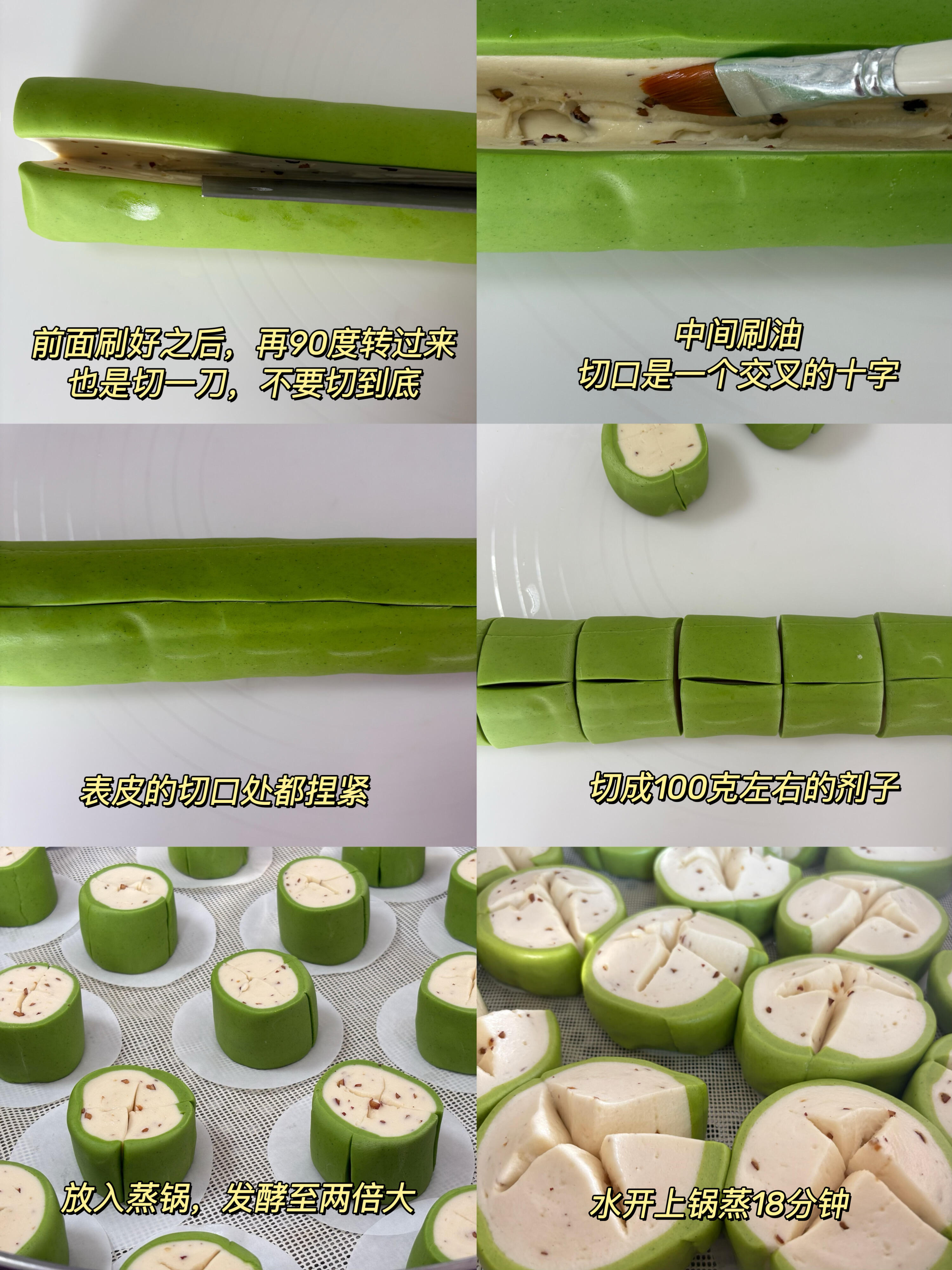 Step 2:白色面团搓条,绿色面团擀皮——像包“绿色被子”!