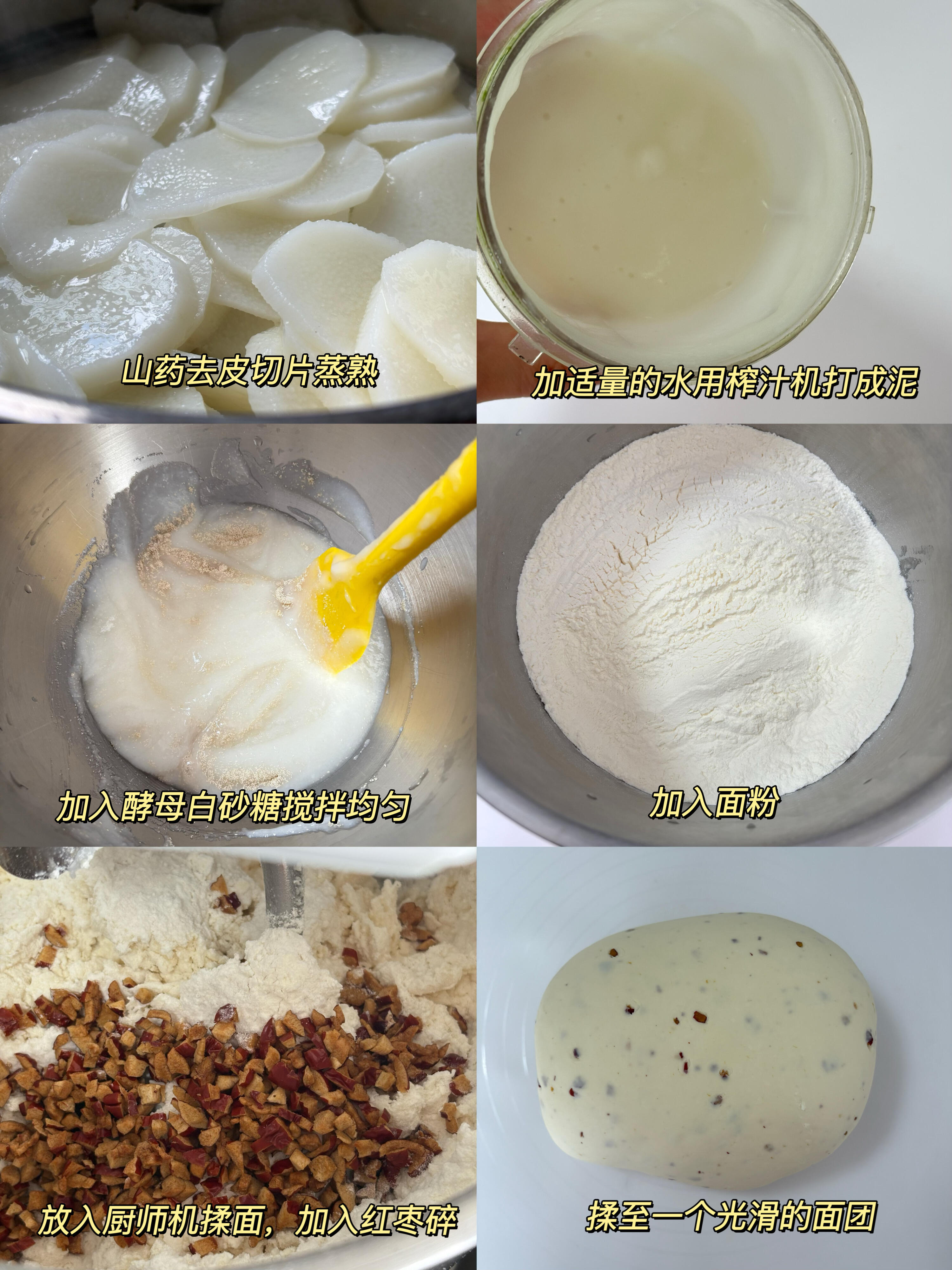 1. 山药去皮切片,蒸锅上汽后蒸20分钟,捣成泥(放凉备用,太热会烫死酵母);
