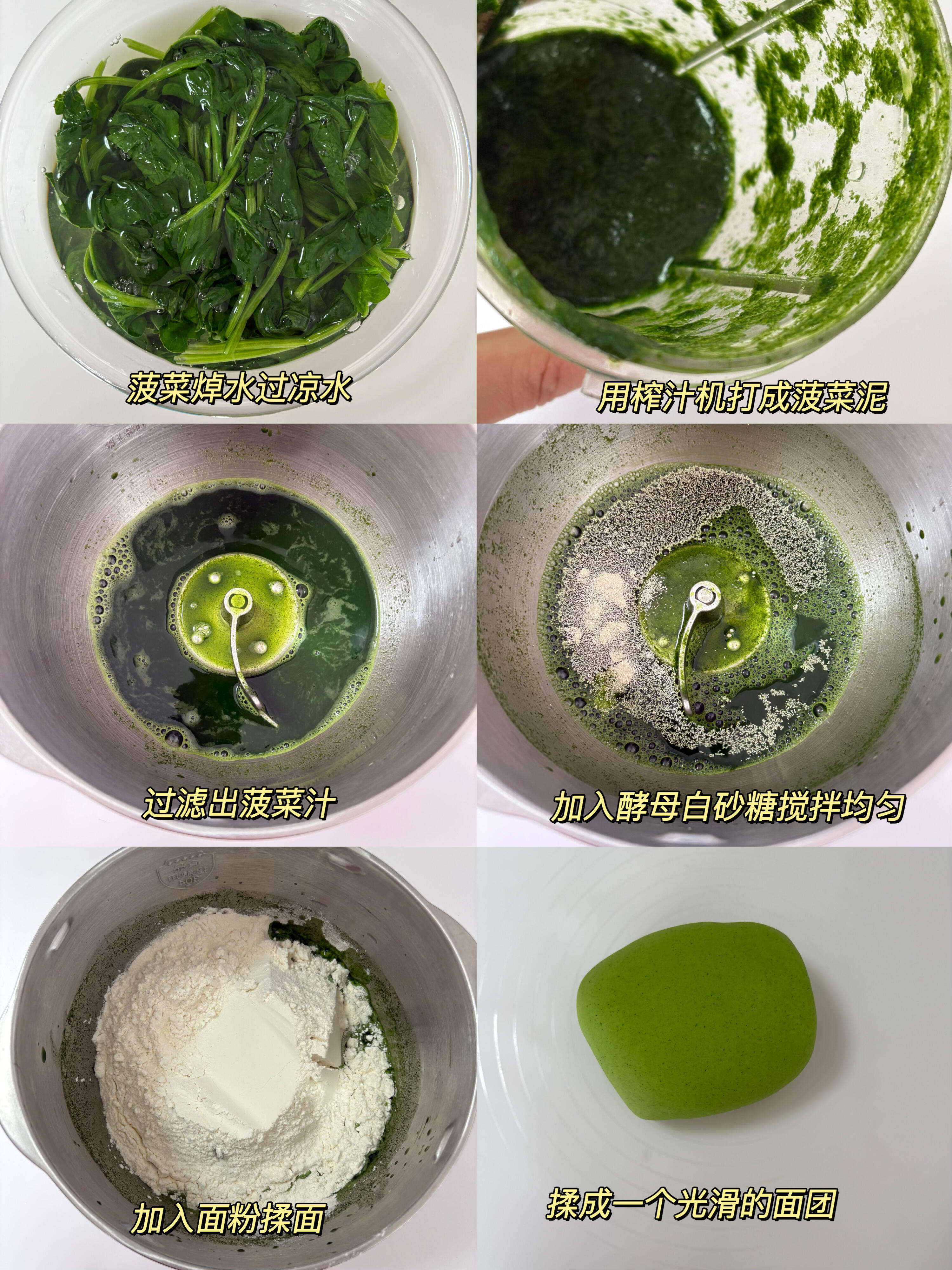 • 绿色面团(菠菜皮):菠菜100g、普通面粉200g、酵母3g、白糖10g