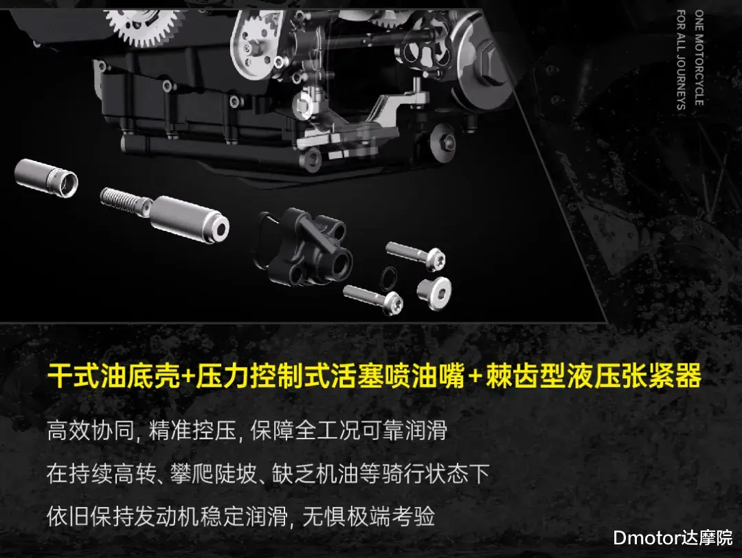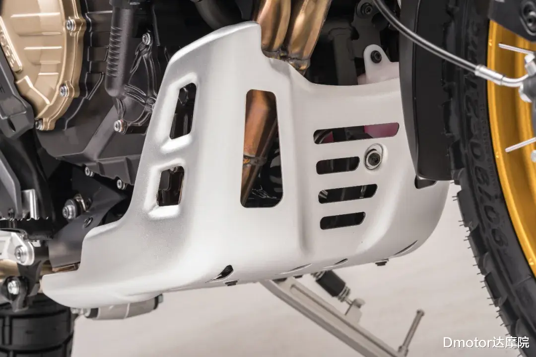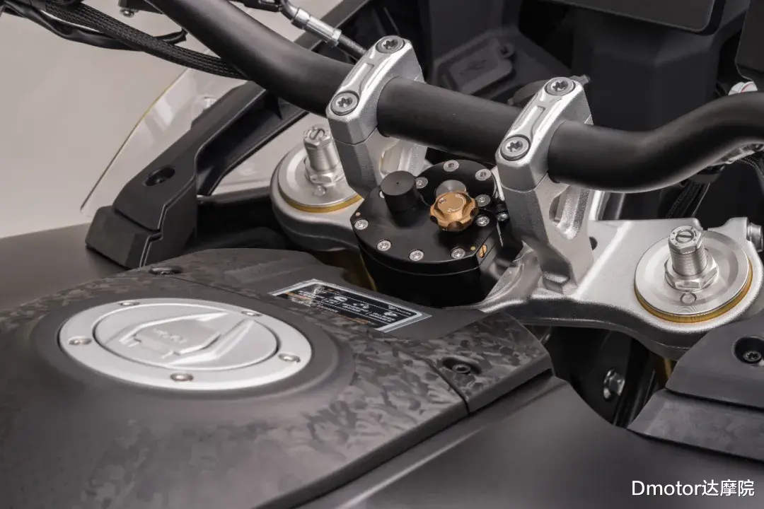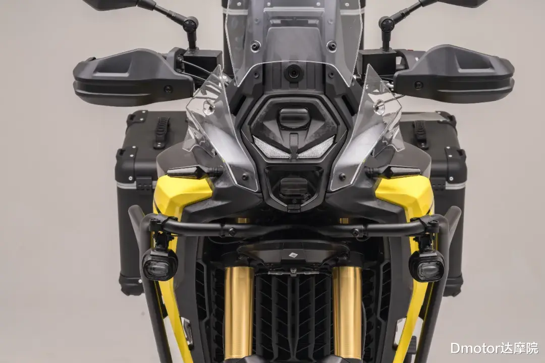 答案之一就是它搭载国内ADV中唯一封闭式盾形阻尼器(钛尺),实际功能类似仿赛杆式钛尺,对于骑手在摩旅高速巡航或者挑战野外烂路时候,能够抑制车头震动,提高骑行安全性,更适合入门的用户。