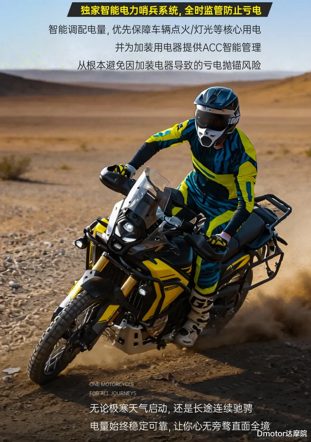 另外,针对野外复杂路况和长途摩旅容易亏电打不着车的情况,无极DS800X搭载越野车导链器和全时监管防亏电的智能电力哨兵系统,解决用户痛点。