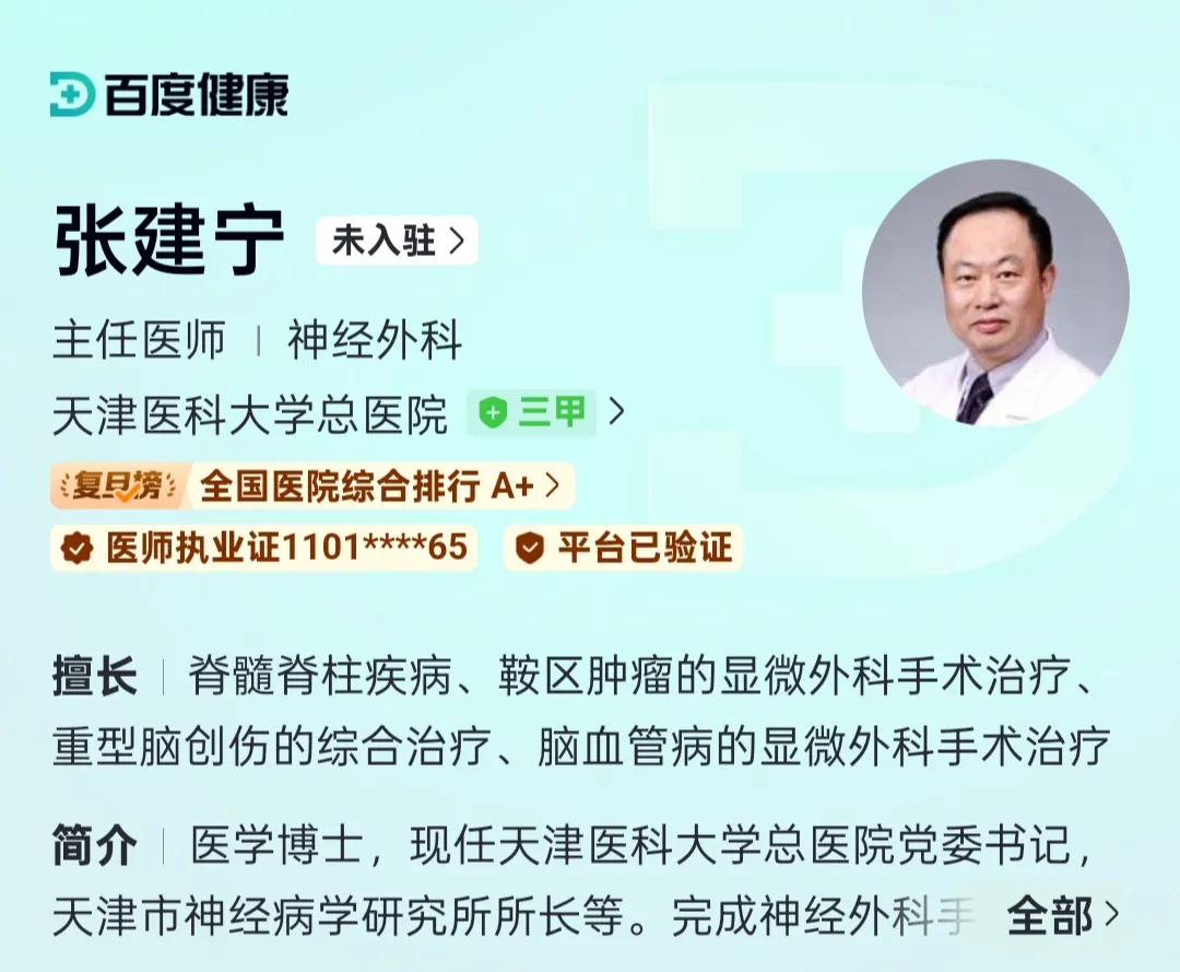 资料显示,张建宁,男,1961年8月出生,中共党员,医学博士,1978年进入江西医学院医疗系学习,1986年起于天津医科大学攻读神经外科硕士及博士学位,2001年赴美国贝勒医学院进行博士后研修。天津医科大学总医院主任医师、教授、博士生导师。迄今指导博、硕士研究生124名。