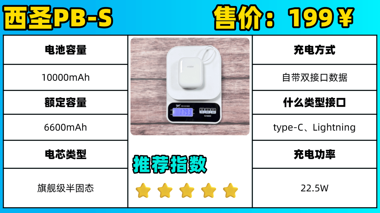 ★ ★ ★ ★ ★西圣PBS半固态充电宝:西圣PBS半固态充电宝在电池容量上是真的耐用,同样是10000mAh电池容量,这一款充电宝因采用的电芯是半固态级别,额定容量高达6600mAh,在测评充电次数,可以给苹果手机成功充满2次,并进行第3次充电时,手机电量成功充到了75%才彻底没电。半固态电芯充电宝在耐用性、能量密度都是比较高的,因此想要一款耐用的充电宝,可以直接选这一款。