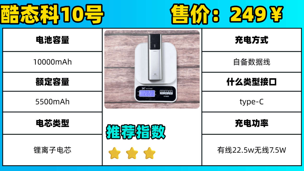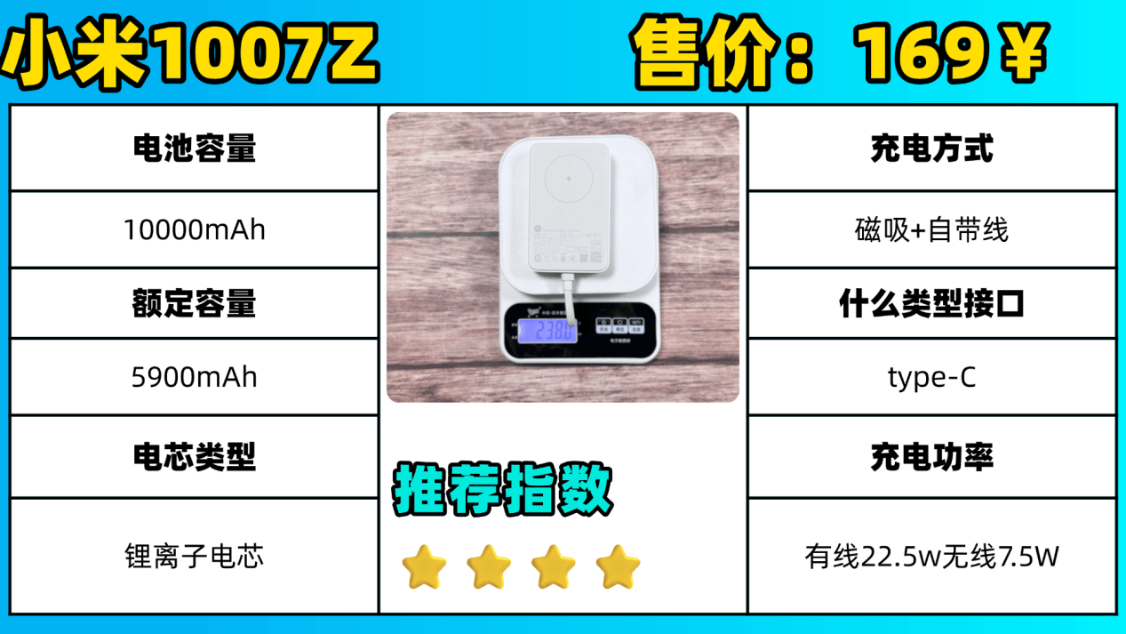 为了节省大家的时间,同时给赶时间的伙伴们总结出来今天的测评结果,用最短的时间买到性价比最高的充电宝。下面我把充电效率、充电次数、控温散热等维度都进行了打分,并且把每一款充电宝的参数都给大家罗列出来了,直接根据自己的需求,对号入座即可,快速锁定最适合自己的充电宝品牌。