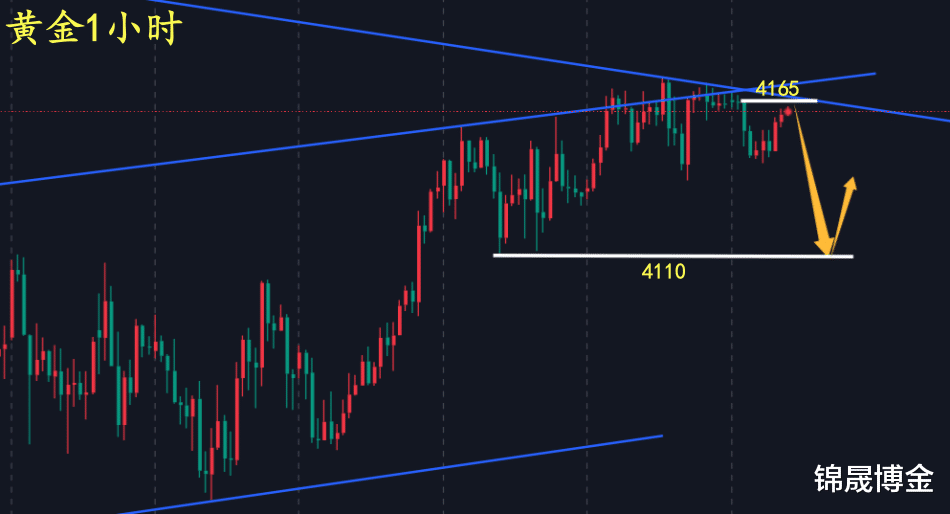 首先这两天的黄金在高位持续横盘整理,很明显的受到4170—4180这个区域的压制,这是本周我一再强调的关键压力位,几乎每天都在去讲,他是整个大的三角收敛,高位宽幅震荡的上方趋势线压制。