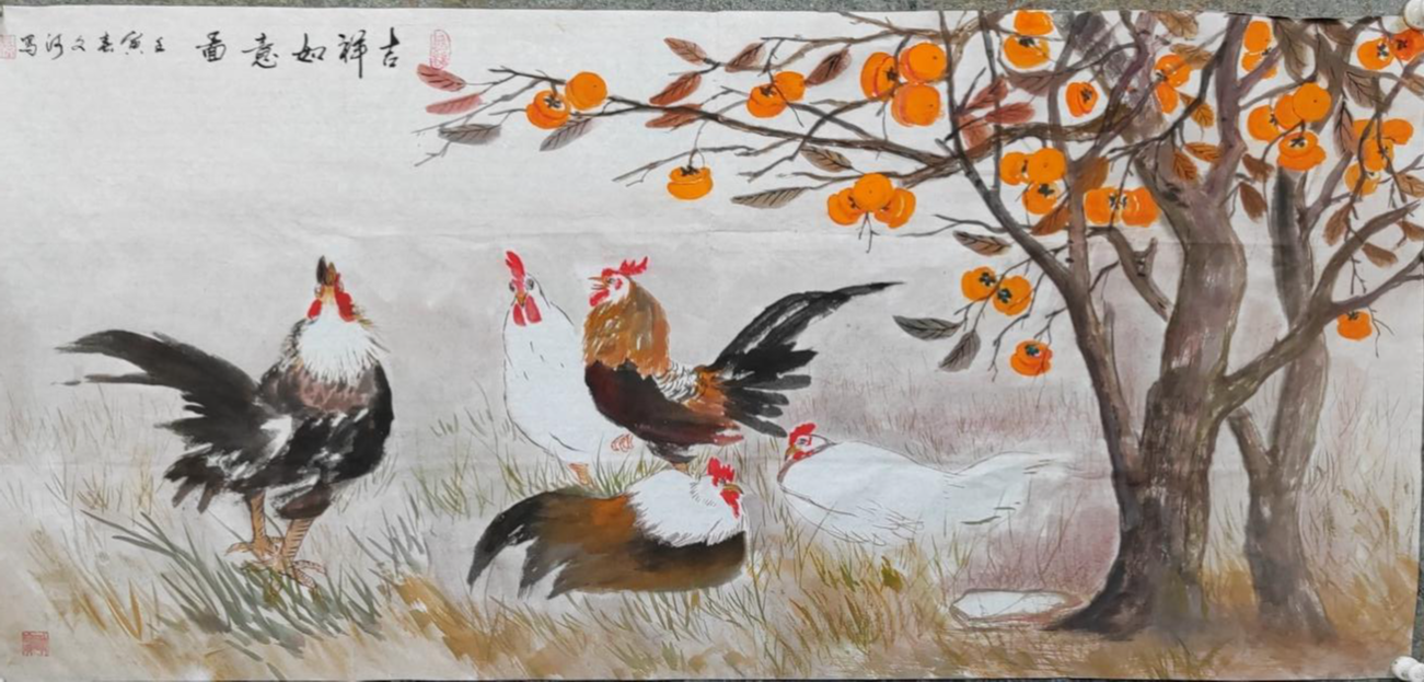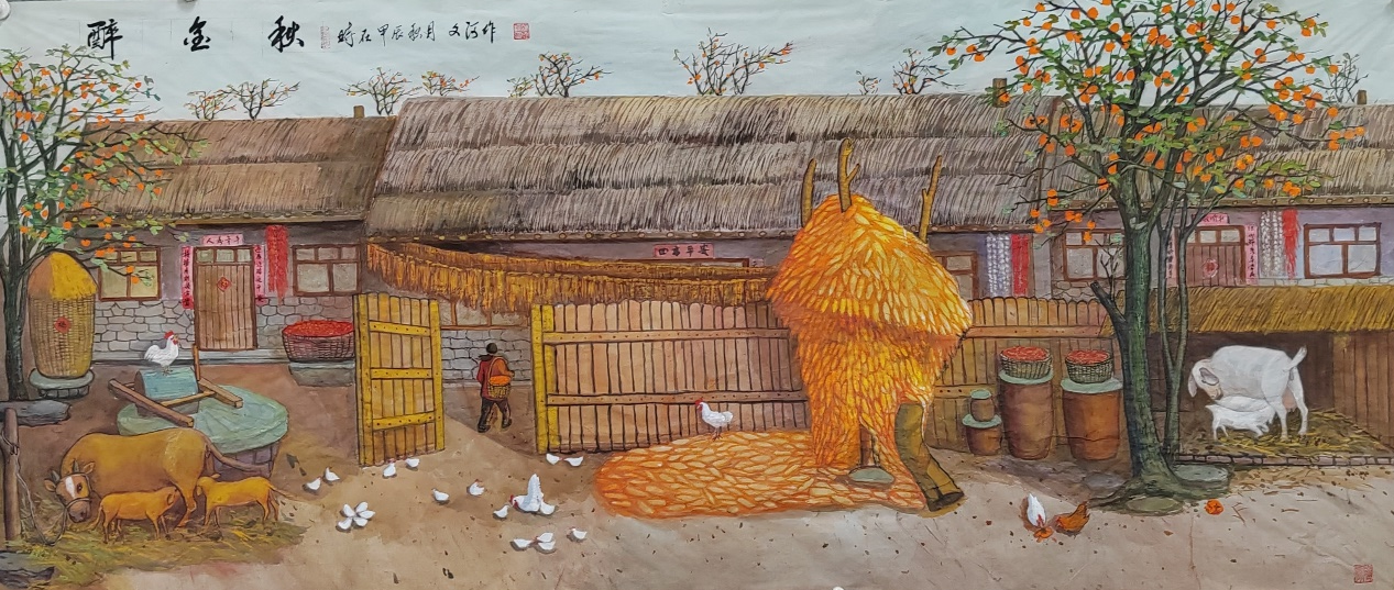 "艺术没有定式,能打动人心的就是好作品。"许文河的创作理念朴素而深刻。他的《醉金秋》系列,以饱满的色彩描绘农家丰收的场景——屋檐下的玉米串带着油画的厚重质感,篱笆边的菊花又透着国画的淡雅意趣,画面中鸡犬相闻的生机,正是他儿时农村生活的温情回望。而《高原风情》则将青海的苍茫辽阔与牧民的质朴坚韧融为一体,油画的写实让雪山的棱角分明,国画的写意让经幡的飘动充满韵律,观者仿佛能听到风穿过草原的声音。