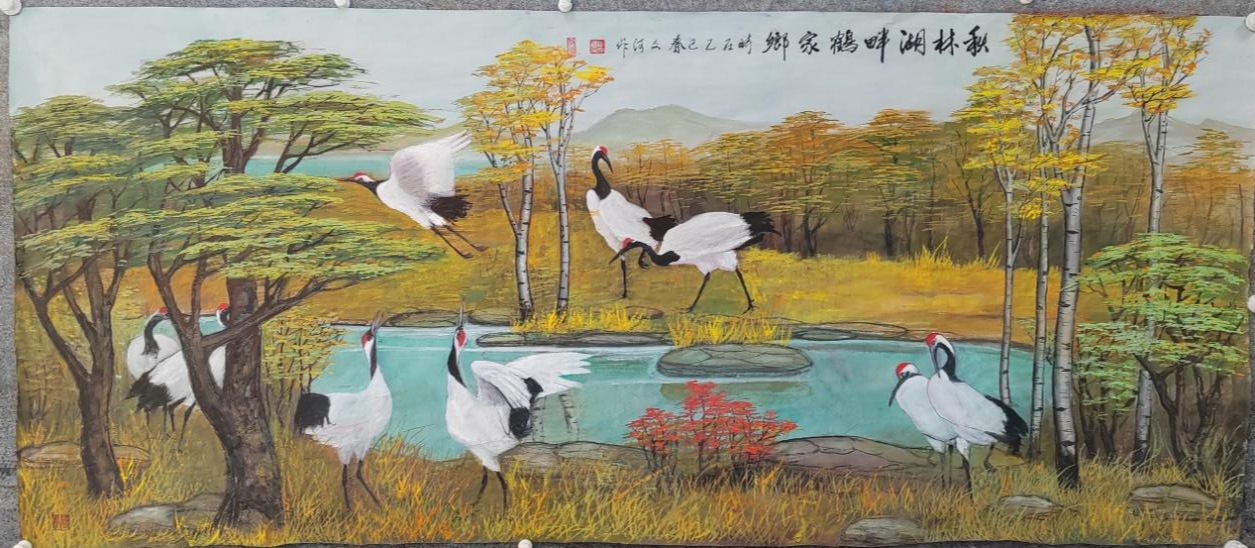 这个念头成了他艺术风格的转折点。他尝试用油画的写实技法表现国画的写意意境:画山水时,以油画的透视法展现层峦叠嶂的纵深感,又以国画的泼墨技巧营造云雾缭绕的空灵;绘花鸟时,用细腻的笔触刻画翎毛的纹理,再以淡彩晕染传递"物有灵犀"的禅意。久而久之,一种"中西合璧、清新明快,朴拙高古"的独特风格逐渐成型。