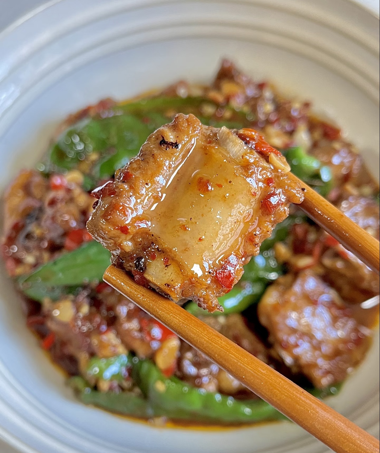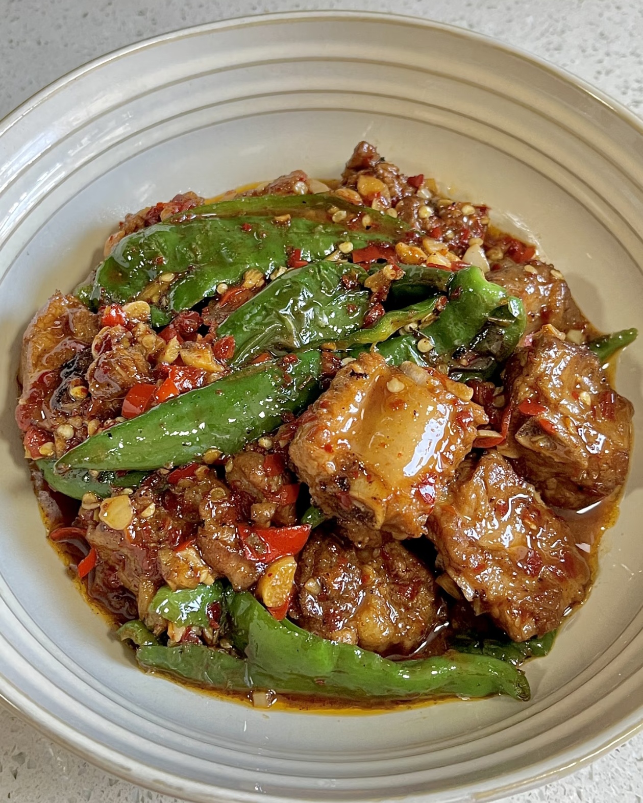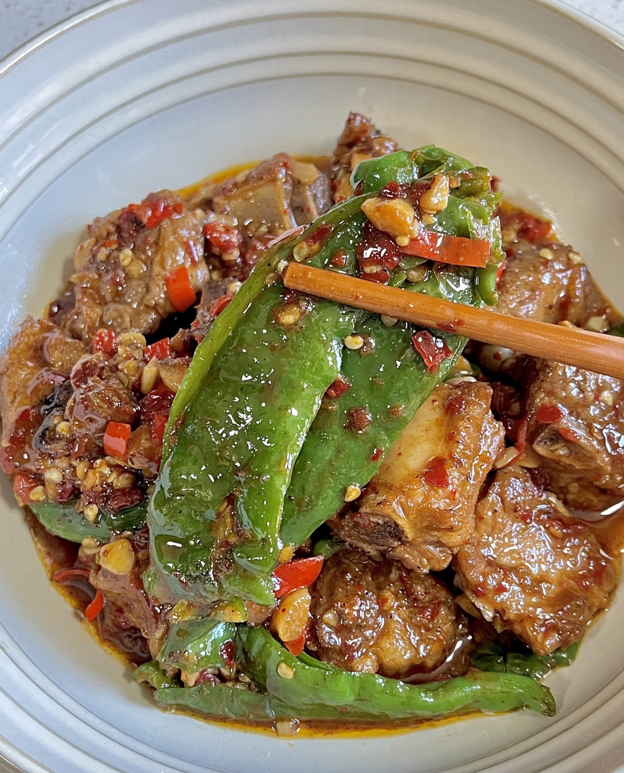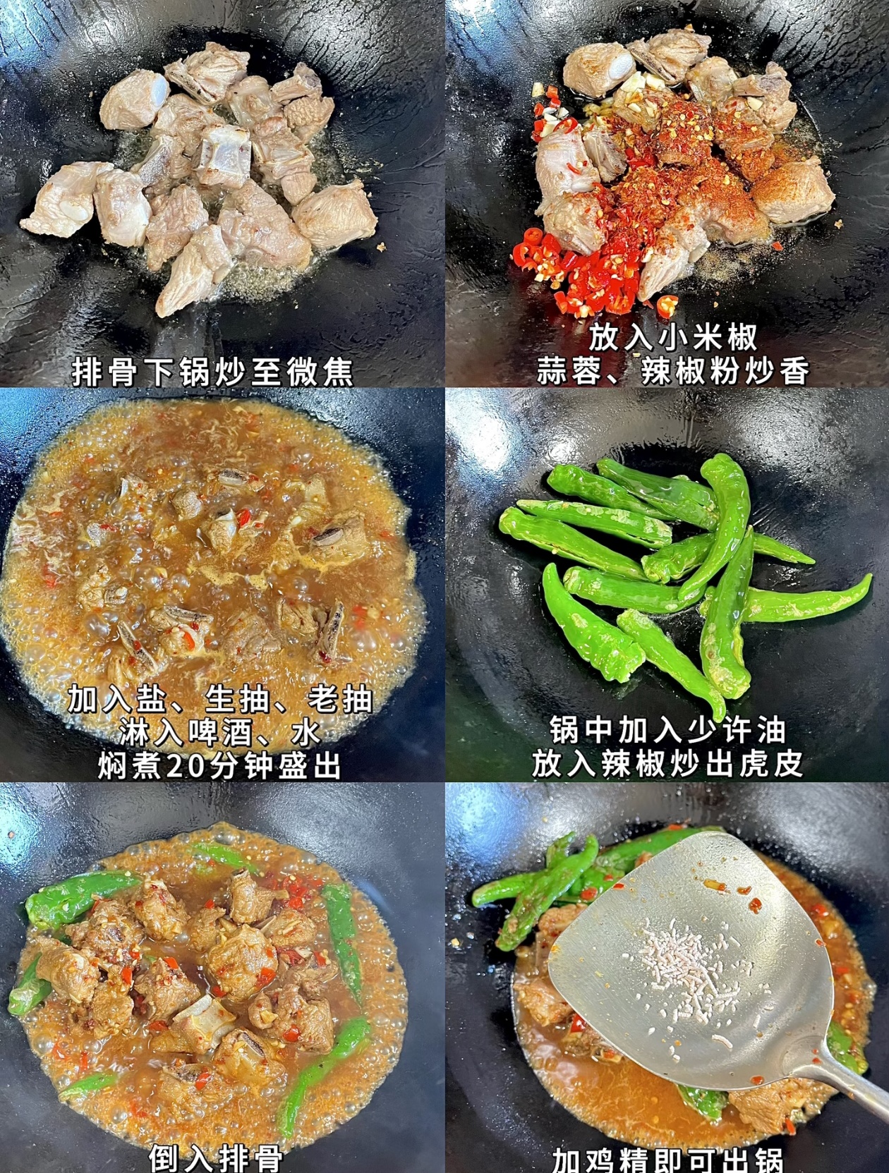 最后,就是所有味道融合的时刻。把刚才焖好的排骨和汤汁一起倒回锅里,和煎好的辣椒混合,开大火快速翻炒,让每一块排骨都均匀地裹上辣椒的香气和汤汁。临出锅前,撒上一小勺鸡精提鲜,翻炒两下就可以关火了。