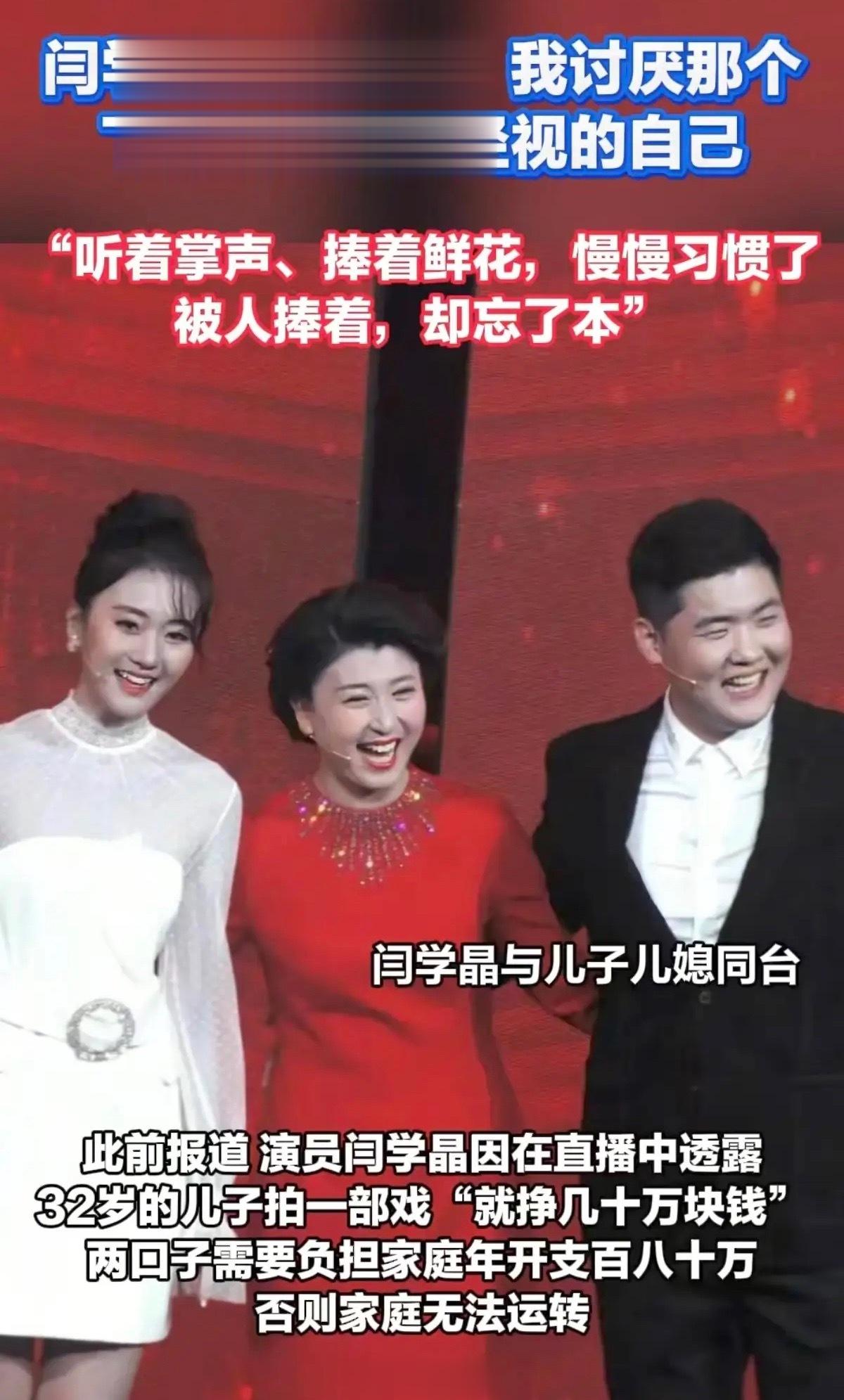 2025年12月29日,国家一级演员闫学晶的直播间里,360万在线观众见证了一场令人错愕的“卖惨”——她抹着眼泪吐槽:“儿子拍一部戏才挣几十万,儿媳音乐剧收入不足十万,北京养家一年没百八十万根本撑不住”,话里话外暗示自己要带病直播补贴儿子,生怕他们“喝西北风”。
