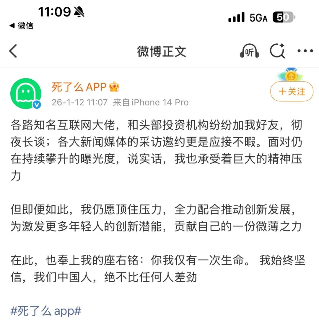 对于app的爆火,“死了么”app官方微博刚刚发文称,各路知名互联网大佬,和头部投资机构纷纷加他们好友,彻夜长谈。“面对仍在持续攀升的曝光度,说实话,我也承受着巨大的精神压力,但即便如此,我仍愿顶住压力,全力配合推动创新发展,为激发更多年轻人的创新潜能,贡献自己的一份微薄之力。在此,也奉上我的座右铭:你我仅有一次生命。我始终坚信,我们中国人,绝不比任何人差劲。”