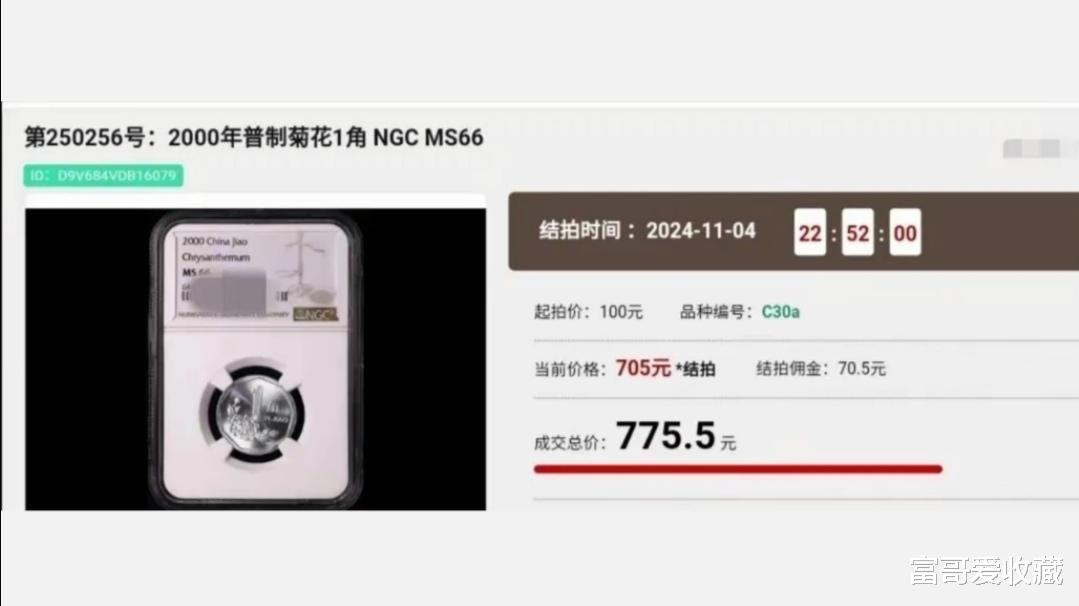 在今年的“春秋大拍”中,一枚NGC评级,66分的普制“菊花1角”,拍了775.5。