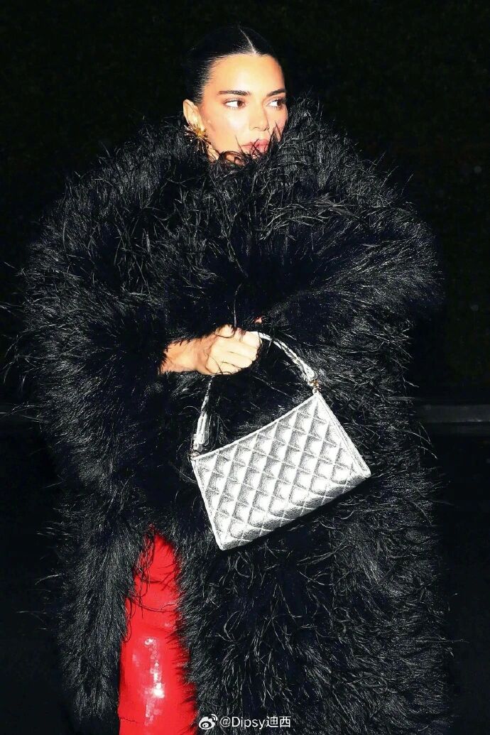 咱再看廓形的小心机:好多人穿羽毛皮草会裹成 “熊”,穿红裙会艳成 “年画”,但 Kendall 是 “松紧对冲”—— 皮草选的是 “短款松垮型”(不是长到压身高的款),红裙是 “及膝紧身款”,长度卡在 “露腿显轻盈” 的点上,皮草的 “松” 裹住红裙的 “紧”,既藏了冬夜的臃肿,又把 “高定的慵懒 + 红裙的热烈” 揉得刚好。