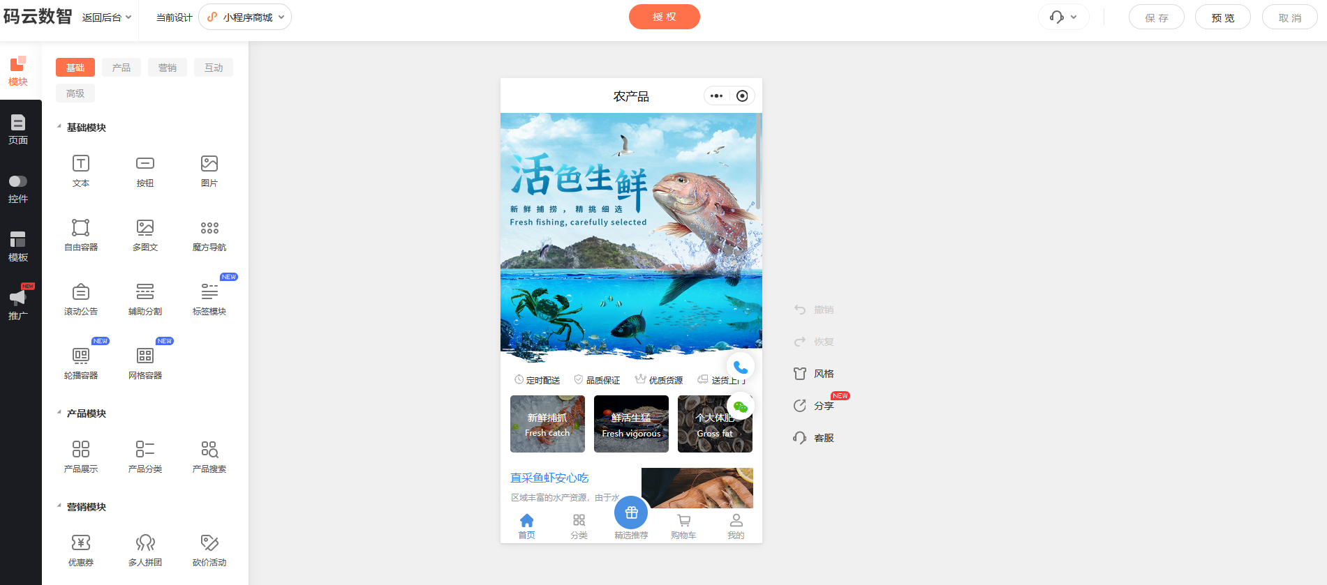 这种零代码的开发模式的话,让小程序制作不再是程序员的这种才可以去做,我们中小企业、商家都可以轻松地制作我们的小程序。模块化的组件的话,是小程序制作平台的一个特点,它就像搭积木一样,把这个小程序的各种功能拆分成一个个独立的模块,然后每个模块的话都有特定的功能样式。比如说导航栏、轮播图表、单按钮列表,然后用户的话可以根据自己的需求自由地选择组合这些模块。然后的话可以快速搭建出我们的小程序的页面结构,比如说我们要做一个电商类型的小程序,我们可以组合商品的展示模块、购物车模块、支付模块,形成一个完整的电商类型的小程序。