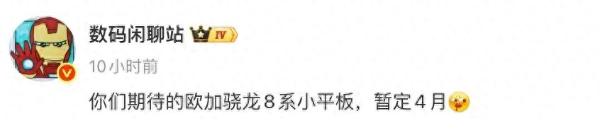 来自博主@数码闲聊站 的一份爆料中显示,“你们期待的欧加骁龙8系小平板,暂定4月”。