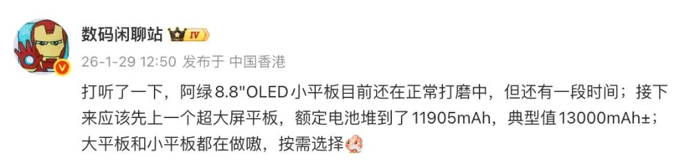 此前,同一位博主的爆料中还提到过:“阿绿8.8"OLED小平板目前还在正常打磨中,但还有一段时间;接下来应该先上一个超大屏平板,额定电池堆到了11905mAh,典型值13000mAh±;大平板和小平板都在做嗷,按需选择”。