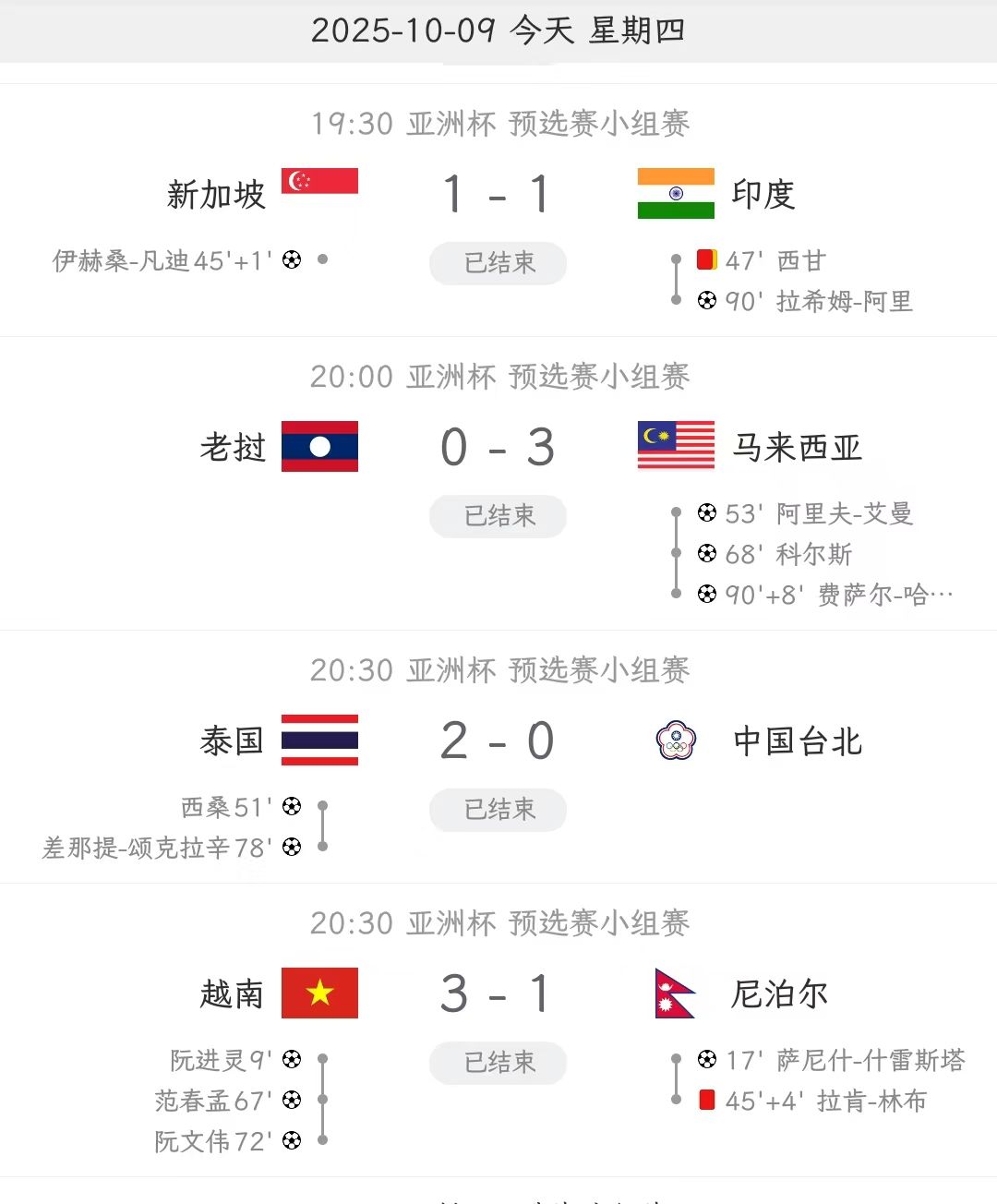 【1】新加坡1-1印度:上半场补时阶段,凡迪帮助新加坡取得领先,下半场刚刚开场第47分钟,印度被罚下一人,之后在90分钟,阿里为印度完成绝平。赛后,新加坡1胜2平积5分,印度2平1负积2分。14号晚上十点,两队将在印度再次交手。