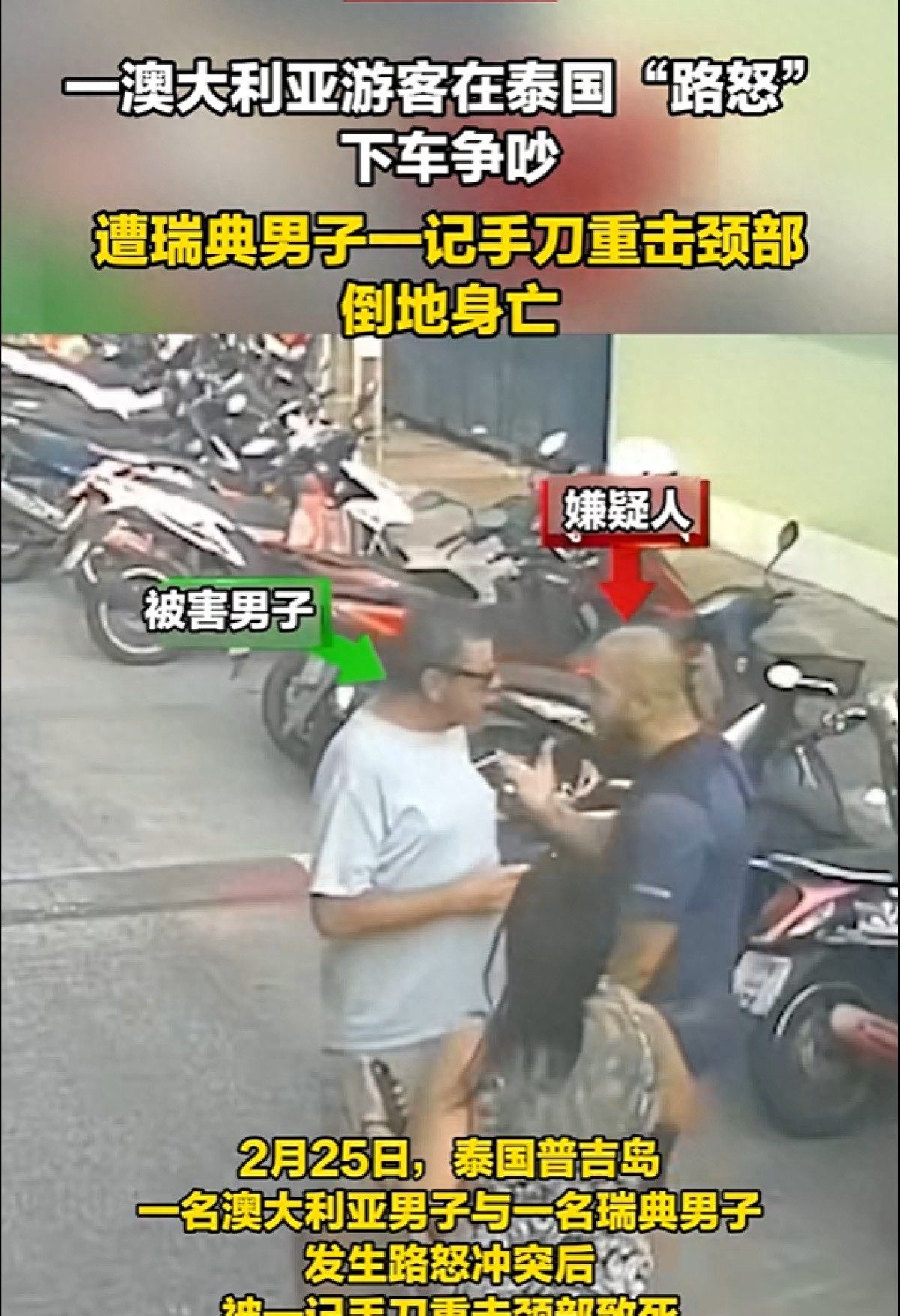 2月25日,泰国普吉岛一名澳大利亚男子与一名瑞典男子发生路怒冲突,被后者一记手刀重击颈部致死。