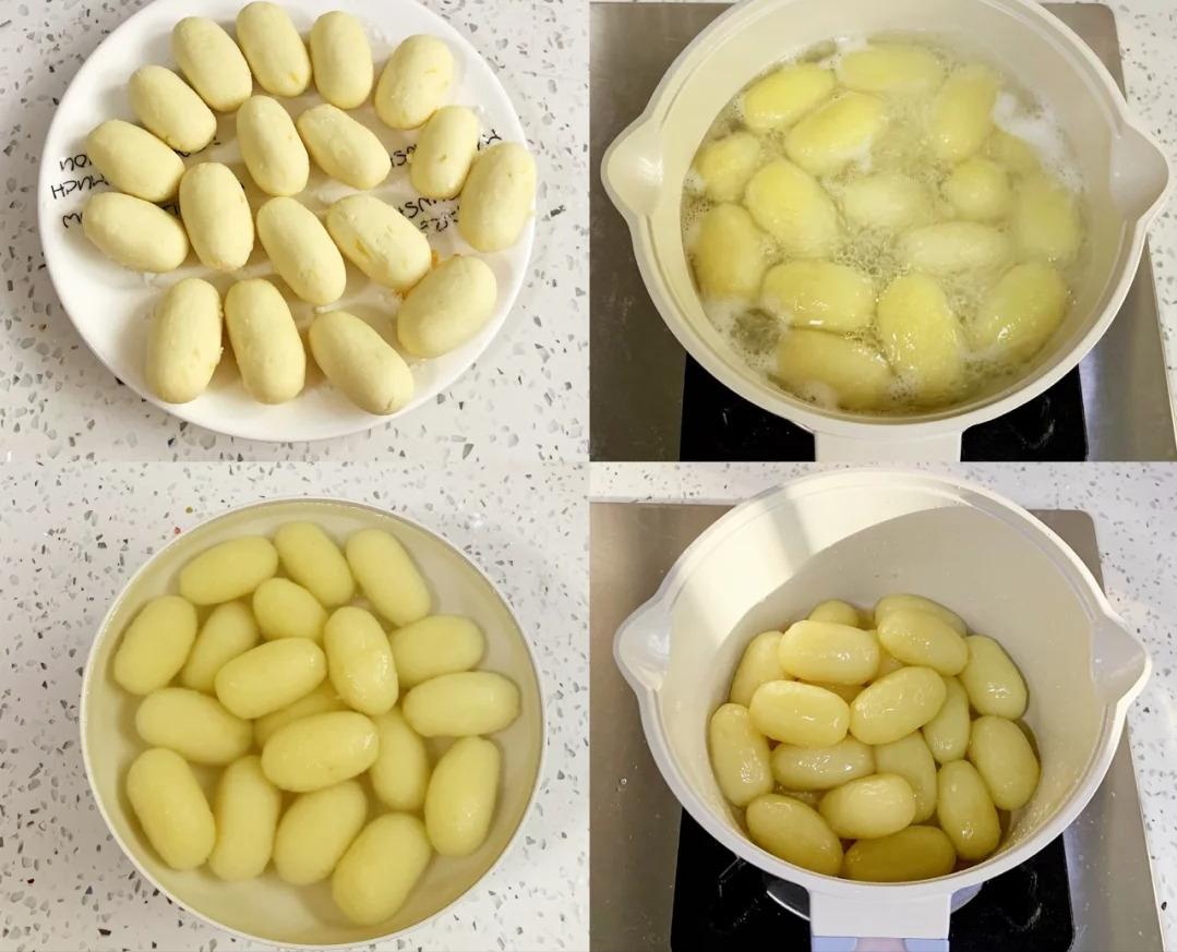 2、揉好面团后,咱把它分成一个个大小差不多的小团子,搓成椭圆形。这时候,奶锅里的水也烧得咕噜咕噜冒泡了,把搓好的土豆年糕放进去煮,等它们一个个都浮起来,就赶紧捞出来,过一下凉水,这样年糕会更 Q 弹。