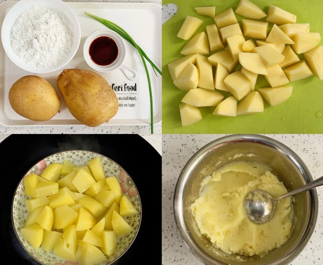食材:300 克土豆泥、100 克红薯淀粉、2 勺生抽、2 勺食用油、 1 勺葱花