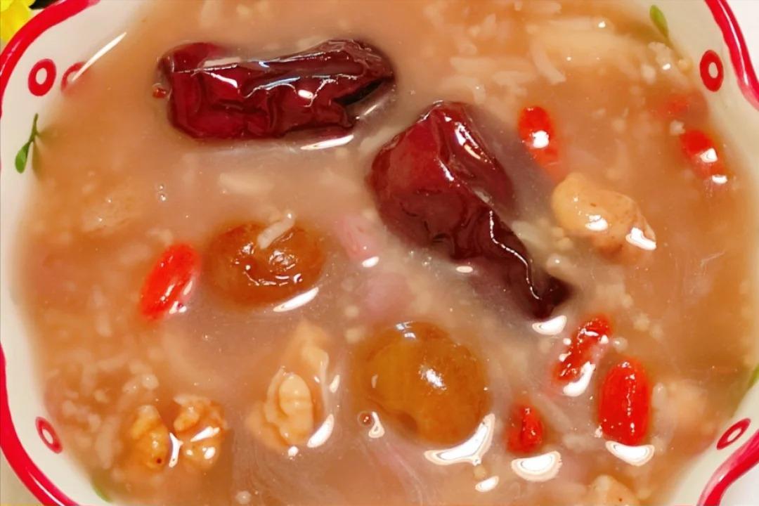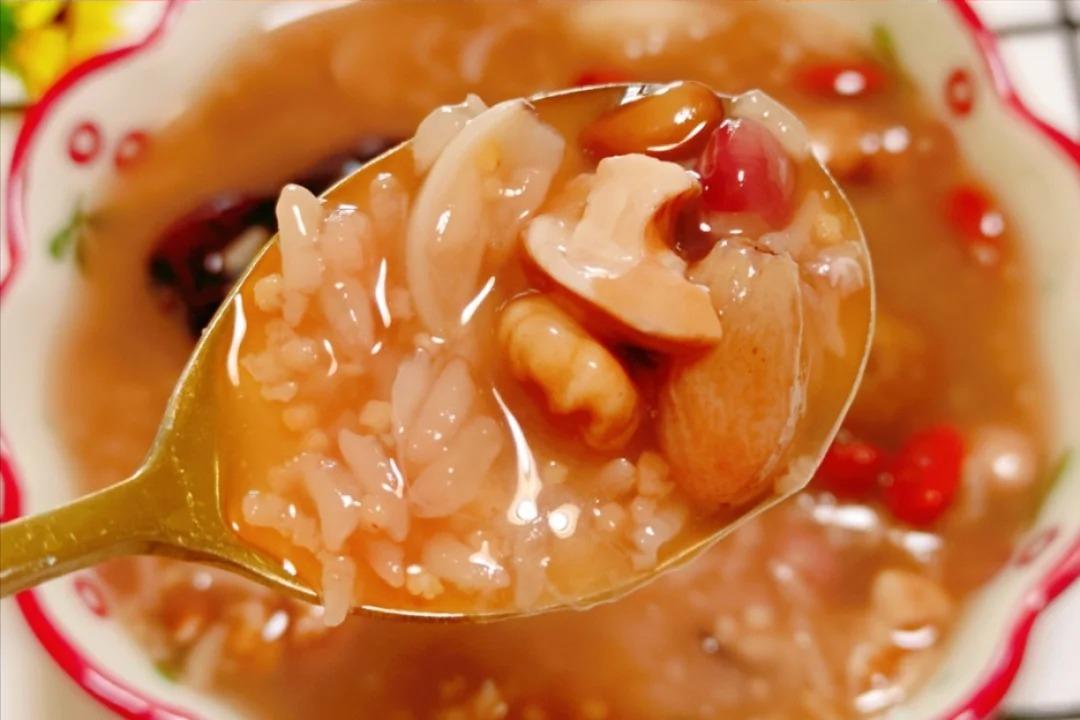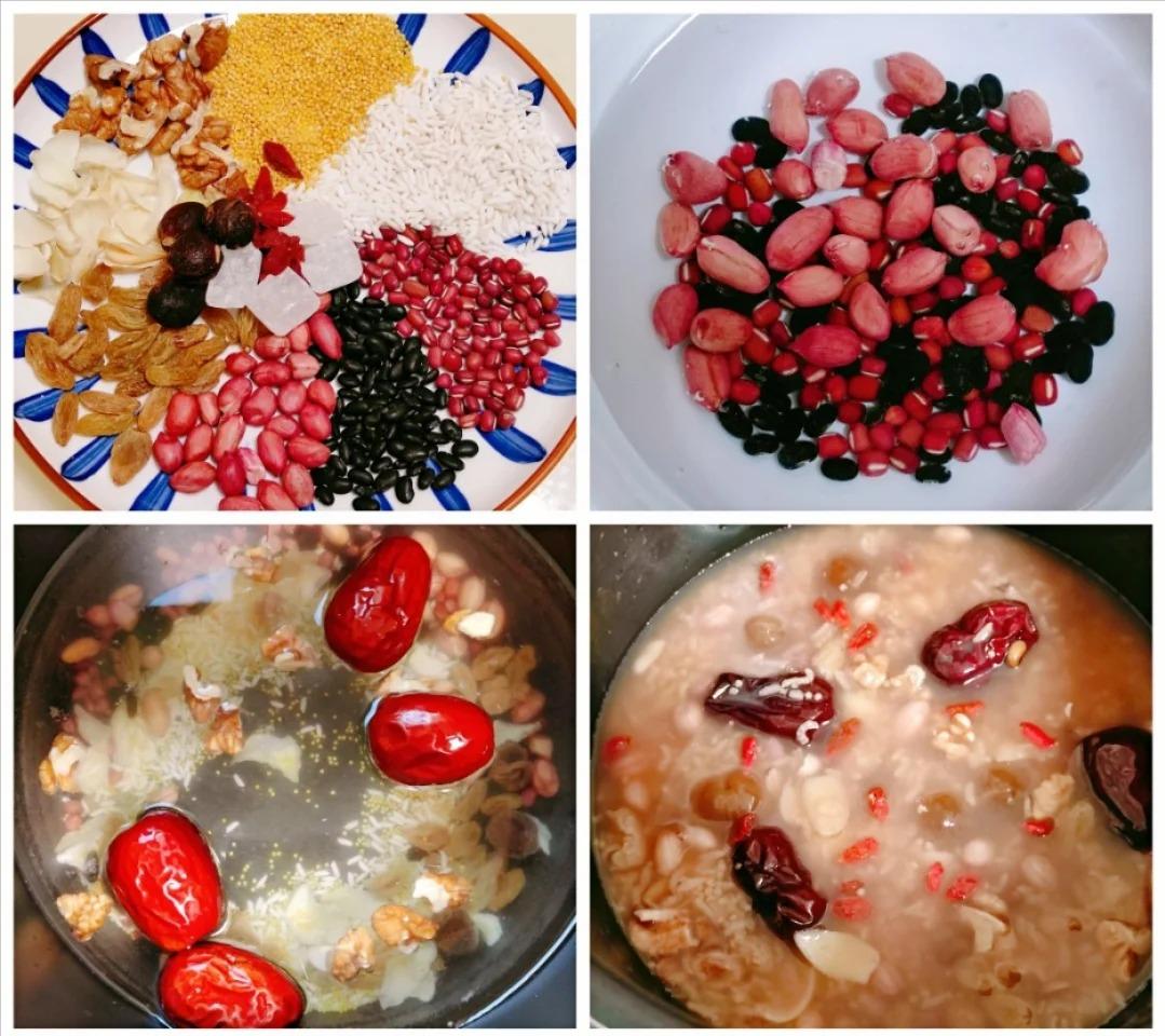 食材:红豆、黑豆、花生、葡萄干、糯米、小米、核桃、百合、桂圆干、冰糖、枸杞、红枣
