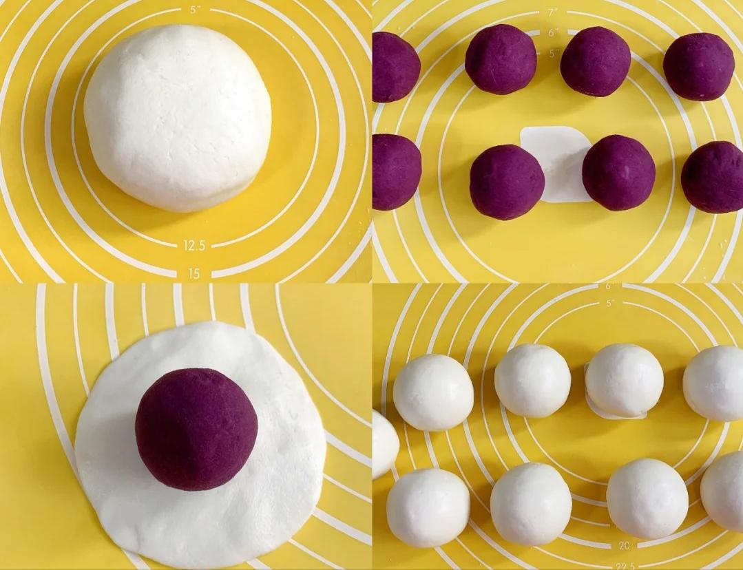 3、紫薯山药馅和糯米团各分成9等份,取一份糯米团搓圆按扁,包入馅料,入蒸锅中蒸煮12分钟。