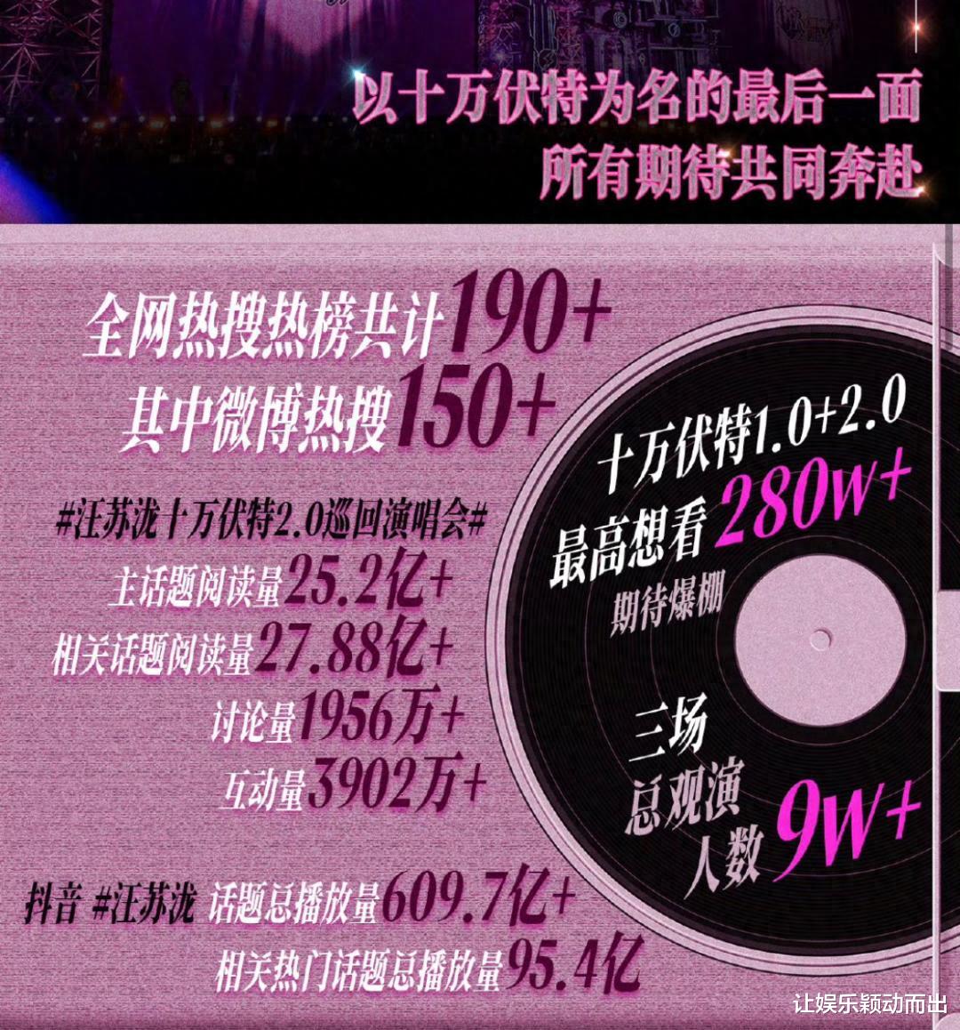 从2025年12月31日的跨年场开始,《十万伏特2.0》持续三天的“落幕”创造了内娱演唱会现象级的热度:3日总观演人数超9w人,拿下累计全网190+热搜热榜,其中主话题#汪苏泷十万伏特2.0巡回演唱会#阅读量超25亿,互动量近4000w。