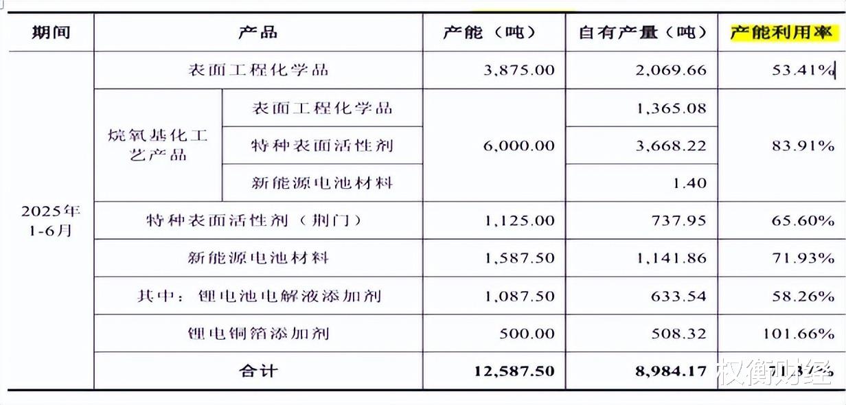 再看吉和昌的产能利用率,2025年1-6月,公司表面工程化学品的产能利用率仅53.41%,特种表面活性剂的产能仅65.605,锂电池电解液添加剂的产能率仅58.26%,公司仅锂电铜箔添加剂的产能利用率过百,为101.58%,综合所有产品的产能利用率仅71.37%,可谓产能充分,公司却募资扩产,新增的产能能否顺利消化存在着疑问。