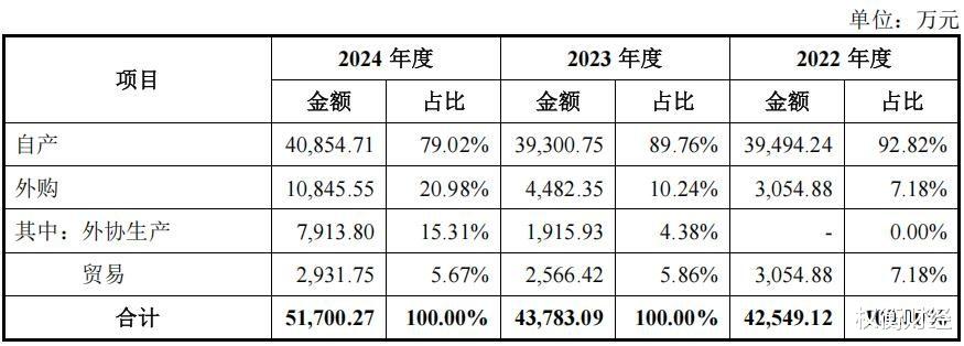 报告期内,吉和昌自产产品收入占主营业务收入的比例分别为92.82%、89.76%和79.02%,呈下降趋势,主要原因系为提高核心产品供应保障能力,自2023年10月开始,公司将异构醇醚等部分大单体产品通过外协生产方式进行生产销售,2024年外协生产销售收入占比有所提升。