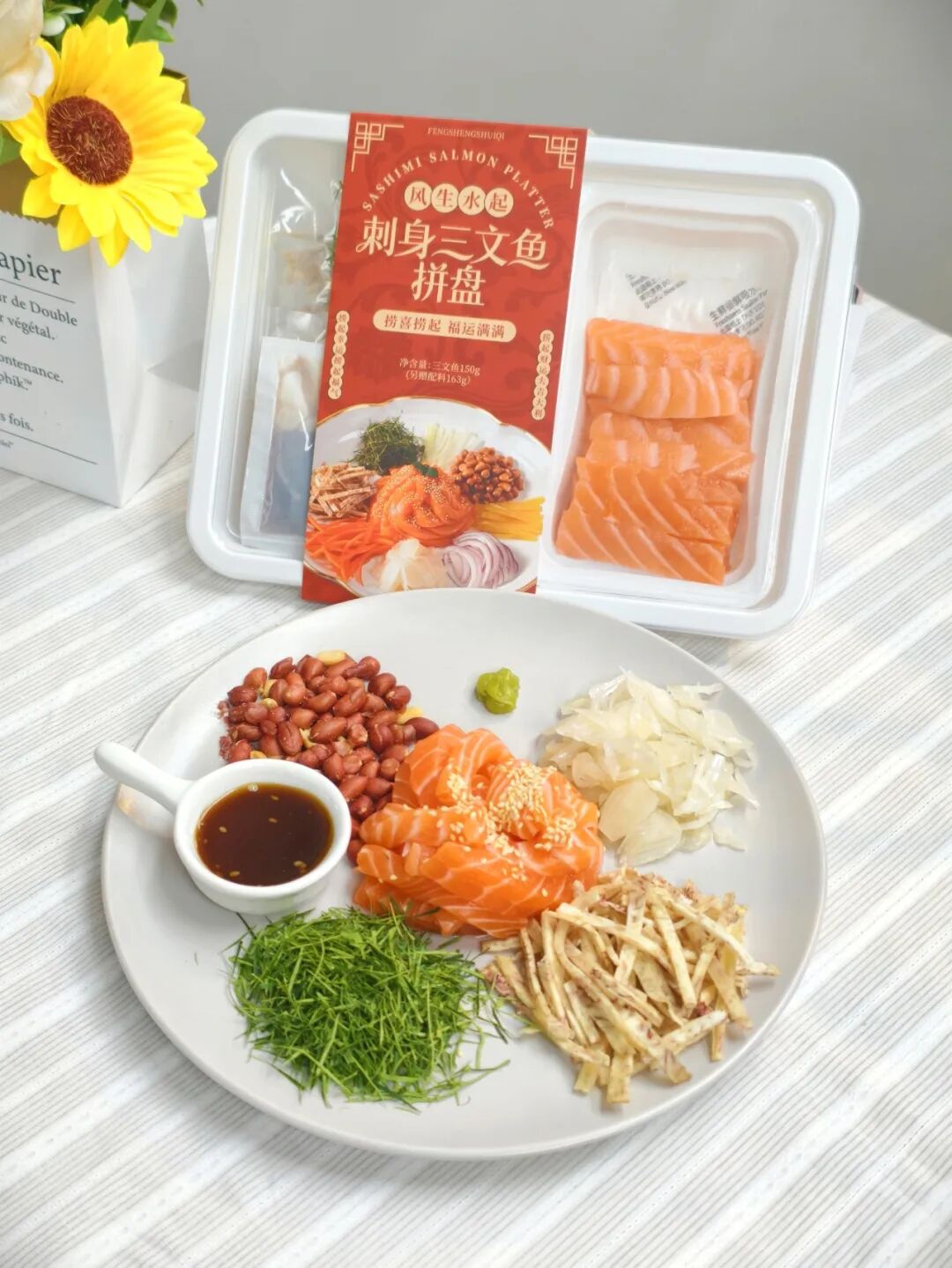 比如,近期在平台上线的“三文鱼风生水起鱼生拼盘”,把三文鱼切片做成搭配8种配料的组合,口感更丰富,也借“捞起”的寓意去贴合年节需求。