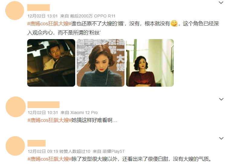 《狂飙》之后,也有不少演员或是网红尝试cos大嫂的形象,但都没有高叶的味道。近期,在综艺节目《王牌对王牌》中,唐嫣又因为cos大嫂上热搜,然而等待她的却是差评一片。