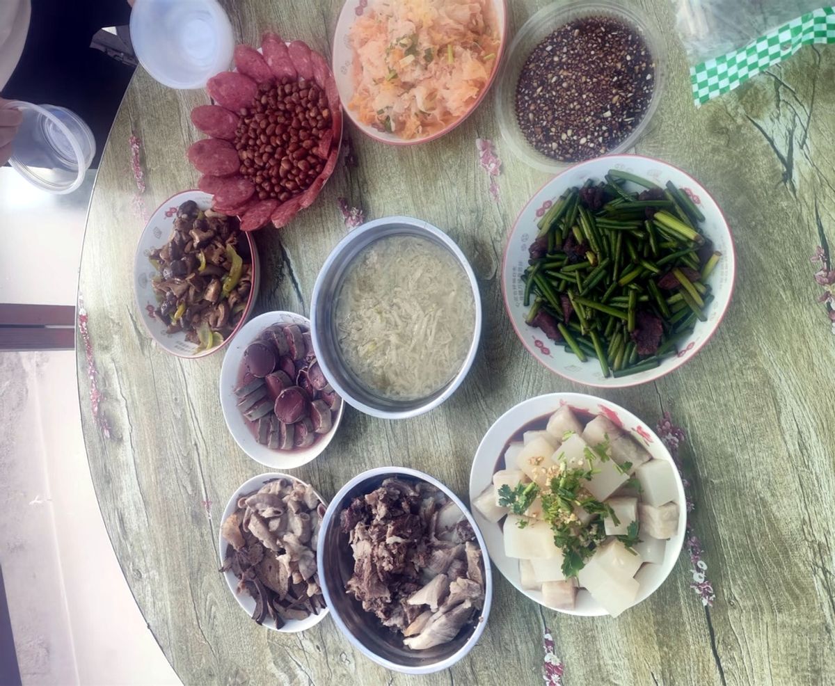 最后给大家说说我们的杀年猪,也是过年前比较有仪式感的活动了,看看吧!这一大桌子杀猪菜必须香香的,杀猪菜就是乱炖,用猪油爆锅,然后下酸菜,下肉,下骨头,下血肠,各种顿,炖熟了就喜欢哪里吃哪里了,那才是嘎嘎香的!