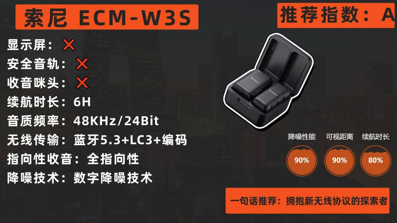 索尼ECM-W3S的设计精髓在于其专业的无线音频链路与生态整合能力。其传输核心(蓝牙5.3+LC3+) 是目前消费级无线音频的先进方案,兼顾了高音质、低延迟与强抗干扰性,150米的有效距离极具实用价值。音质处理上,数字降噪技术精准而不生硬,能保留人声的饱满质感。硬件上,高品质麦克风单元与48kHz/24Bit的采样能力,为专业后期制作提供了优质素材。与索尼相机通过Mi热靴直连时,可进行数字化传输和控制,体验流畅。不过,这套先进无线系统的全部潜力,在与非索尼设备连接时可能无法完全发挥,对于多品牌设备混用的用户,其优势会被削弱。