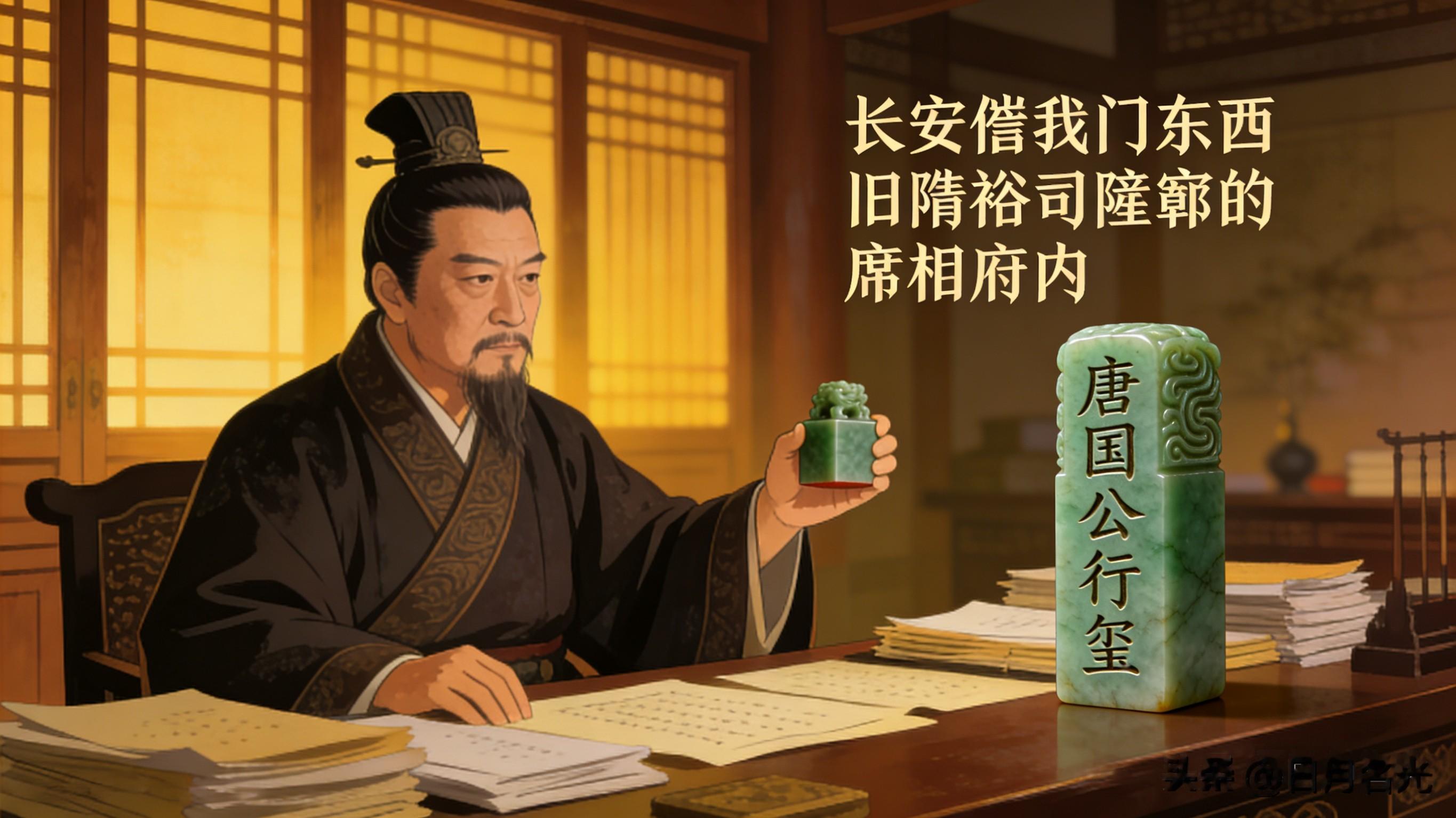 隋义宁元年(公元617年)十一月甲子,李渊扶立代王杨侑即位后,自居大丞相府于长安虔化门东侧旧隋光禄寺廨署,其案头每日堆积的文书皆需用紫泥重封方可发出,唯有一方镌刻“唐国公行玺”的青玉印章从不离身。