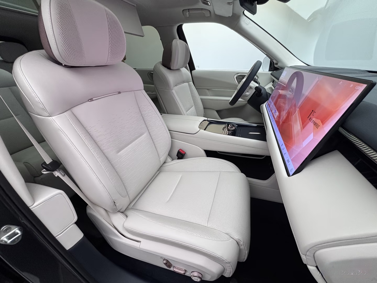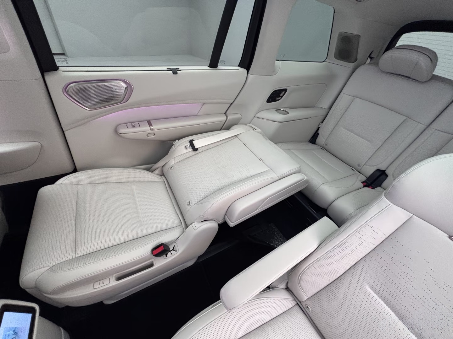 如果说纯平地板和六座舒适是基础,那第二排旋转座椅就是领克900空间玩法的核心。这组座椅支持90°侧转和180°向后旋转,搭配550mm的超长滑轨,能玩出多种场景模式。试驾时我们试了亲子模式,把第二排座椅180°转向,和第三排形成1.7米间距的“移动会客厅”,孩子坐在第三排玩玩具,家长在第二排就能随时照看,配合后排30英寸6K悬浮娱乐屏,放个动画片就能让全车安静下来。