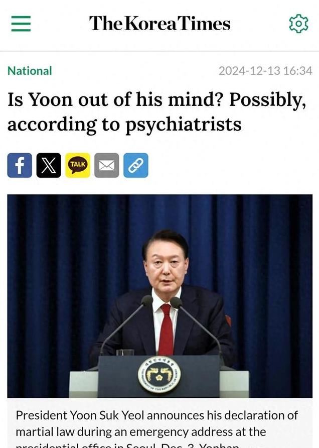 据博主悉察与洞见爆料:12月13日,韩国媒体《韩国时报》发表一篇报道,称韩国的精神病专家团队发出警告,韩国总统尹锡悦可能患有严重的精神疾病。