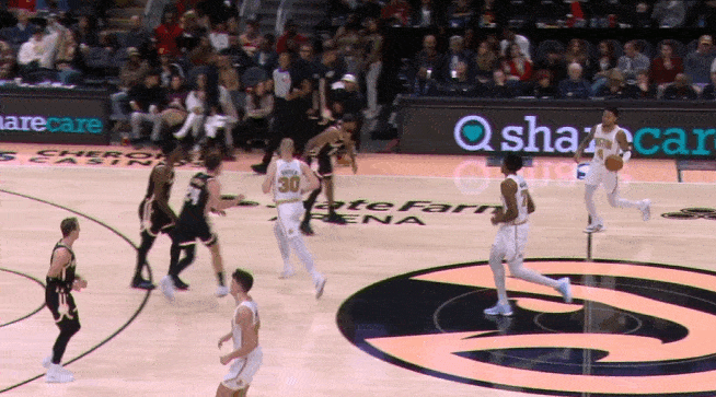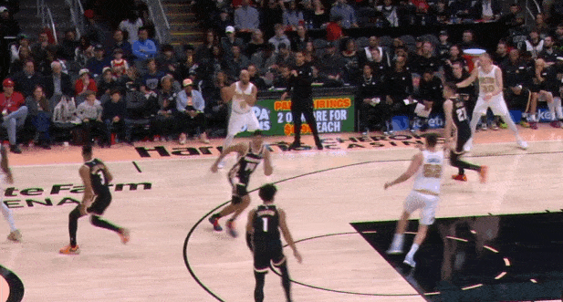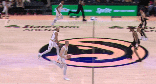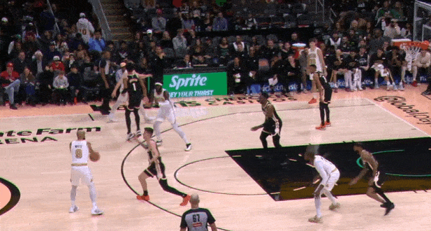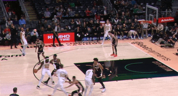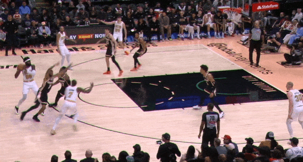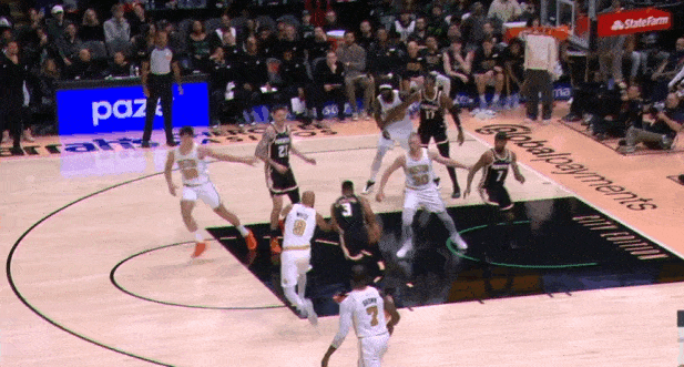 两个战术同时启动的组合:怀特和奎塔弧顶发动"Get“配合,与此同时左侧的豪瑟和冈萨雷斯执行“Twirl”。豪瑟无球上提获得空位机会,接球垫步调整后三分稳稳命中。