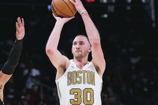 豪瑟弱侧底角接球大空位三分抬手就进,惩罚克雷伊奇的放空。