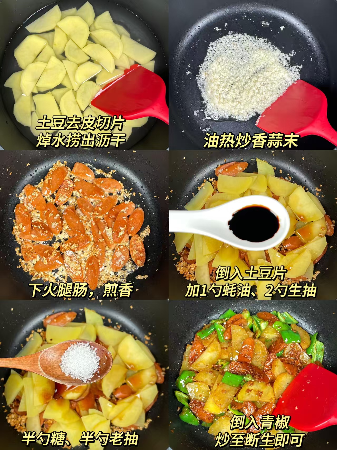 土豆 1 个(切薄片)、火腿 2 根(切片)、青椒 1 个(切块)、蒜末 3 瓣、生抽 1 勺、蚝油半勺、盐少许、清水半碗