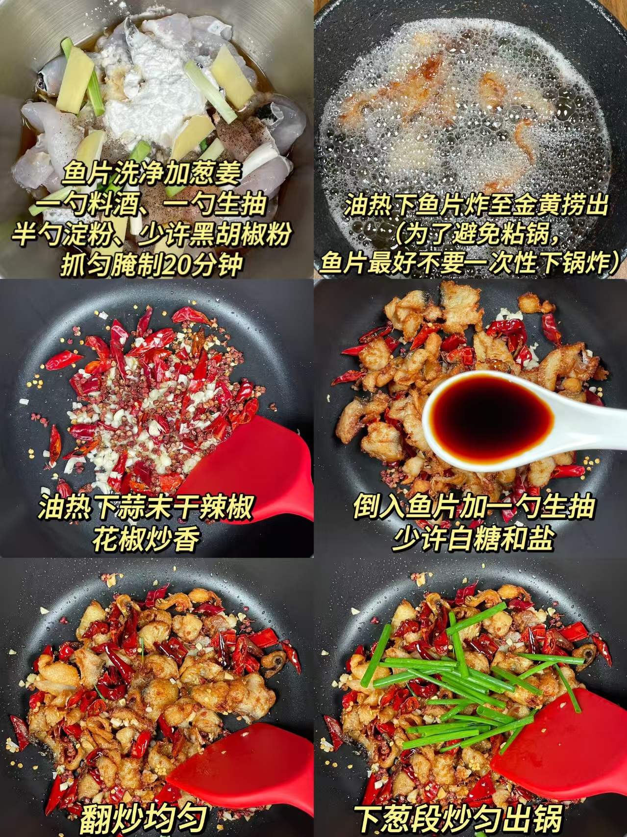 倒入煎好的鱼片,加 1.5 勺生抽,快速翻炒 30 秒,让鱼片裹满红油香料,即可出锅。