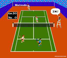 另一个游戏是网球,看到中间的裁判还是马里奥,很负责任的盯着球的去向,做出公正的判断。我们双打的时候,我总是瞎按十字键让自己操作的球手乱转,说是要迷惑电脑对手,偶尔还要跑到裁判椅下面抡几下球拍来表达上一把输球的抱怨。