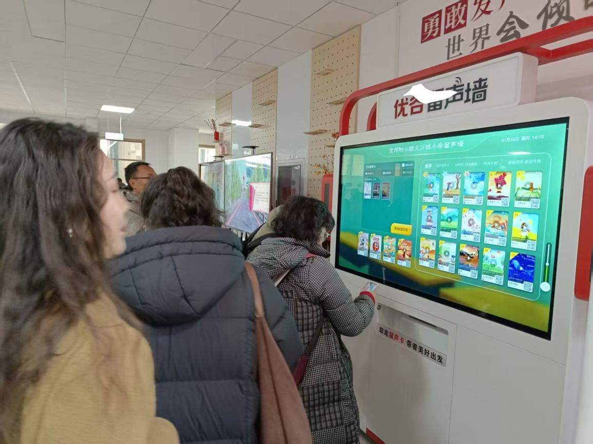 在朗读亭里完成的作品,即刻在留声墙就可以播放展示,更惊喜的是打印出来的精美留声卡,随时随地可以扫码聆听当下朗读的作品,这一定会大大提高孩子们的朗读积极性和自信心。参观交流的校长们不时驻足,与身边的老师深入交流,并对京师附小为孩子们营造的富有思想浸润与文化气息的成长空间表示赞赏。