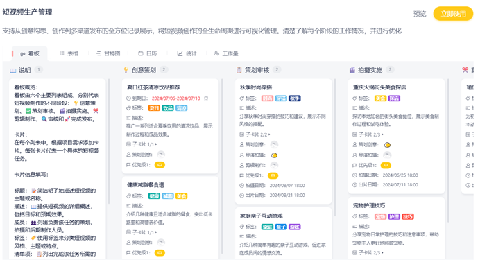 多维度视图切换:看板视图是基础,但甘特视图对内容排期至关重要,日历视图能直观管理发布计划,统计视图有助于分析团队产出效能。