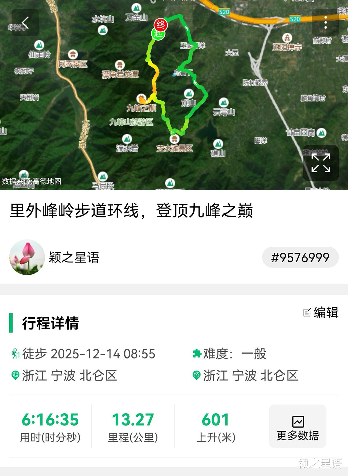 2025年12月14日,刘颖之一行的北仑之行,走的就是里外峰森林游步道环游线路,串联游步道、九峰之巅、瑞岩寺景区等风景名胜,全程13公里多,海拔提升600多米,用时六个多小时,徒步健身赏景皆适宜,参考轨迹:9576999。