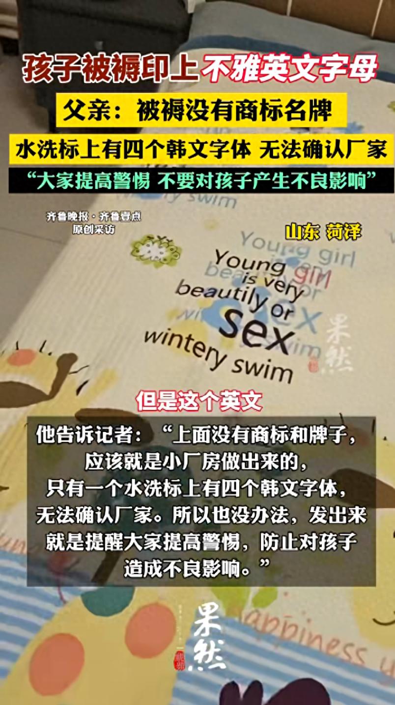 12月6日,一位网友发布视频称自家孩子的婴儿被褥出现不雅英文单词。 12月7日,该父亲在接受记者采访时表示:“褥子是几年