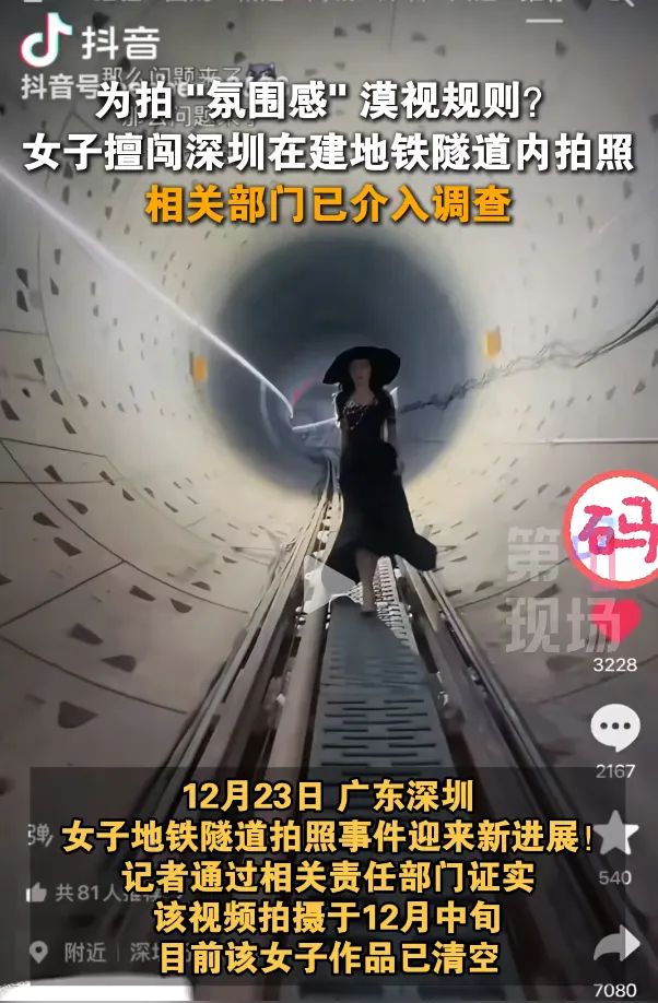 近日,一位女士擅自闯入深圳在建地铁隧道拍摄"氛围感"照片,引发社会广泛关注。