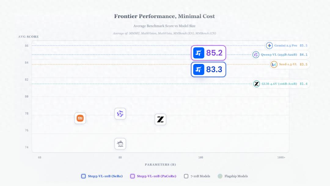 在多项关键评测中观察到,Step3-VL-10B 媲美甚至超越规模大 10-20 倍开源模型(如 GLM-4.6V 106B-A12B、Qwen3-VL-Thinking 235B-A22B)以及顶级闭源旗舰模型(如 Gemini 2.5 Pro、Seed-1.5-VL)。